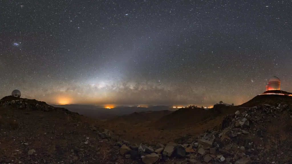Na zdjęciu widać także, pod krawędzią galaktyczną, światła dalszych miejscowości Atakamy. I jeszcze coś – to smuga jasnej poświaty odchodząca od centrum Galaktyki ku górze i w prawą stronę, łukiem. Jest to tzw. światło zodiakalne. Wzdłuż ekliptyki, czyli wielkiego okręgu, po którym Słońce pozornie pokonuje na niebie swoją drogę, w ciągu roku znajduje się szeroki pas zwany Zodiakiem. Pas ten jaśnieje poświatą, wywołaną odbiciem światła słonecznego od cząstek pyłu kosmicznego. Pył jest niezwykle drobny, ale też jest go stosunkowo dużo i dzięki temu światło ze Słońca odbija się w nim. I to zjawisko też na zdjęciu widać.