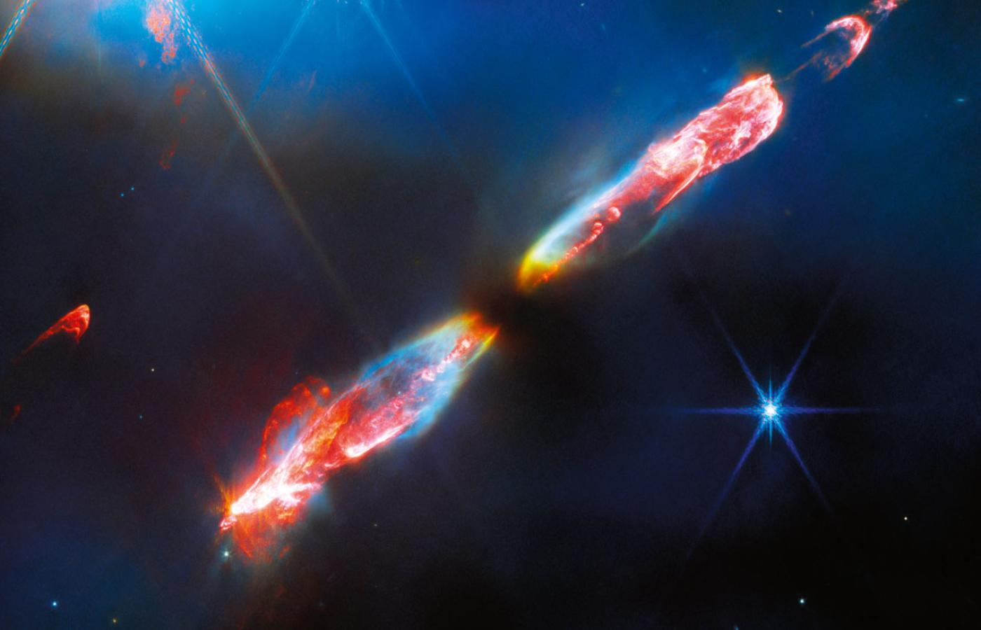 O ile obłoki molekularne mogą dryfować w przestrzeni kosmicznej przez miliony lat, o tyle gdy rozpoczyna się proces zapadania, sprawy dzieją się błyskawicznie (w skali kosmicznej oczywiście). W ciągu zaledwie kilku tysięcy lat tworzy się gęsta i kompaktowa kula gazu, nazywana protogwiazdą. Wokół niej formuje się protoplanetarny dysk pełen gazu i pyłu, który ją karmi. Wtedy najczęściej gwiazda obwieszcza światu swoje narodziny spektakularnymi fajerwerkami: wyrzuca ogromne ilości gazu sformowane w tzw. dżety, które zderzając się z okolicznym obłokiem molekularnym, rozgrzewają go, rozświetlając okolicę. W czasach, gdy obserwacje w świetle widzialnym były jedynym źródłem wiedzy o kosmosie, dżety jako pierwsze sygnalizowały, że w ciemnych chmurach gazu i pyłu dzieje się coś zagadkowego. Wyrzucane z prędkością setek kilometrów na sekundę strumienie gazu uciekają bowiem poza najgęstsze warstwy obłoku, zderzając się z otaczającym gazem i rozgrzewając go do tysięcy stopni.
