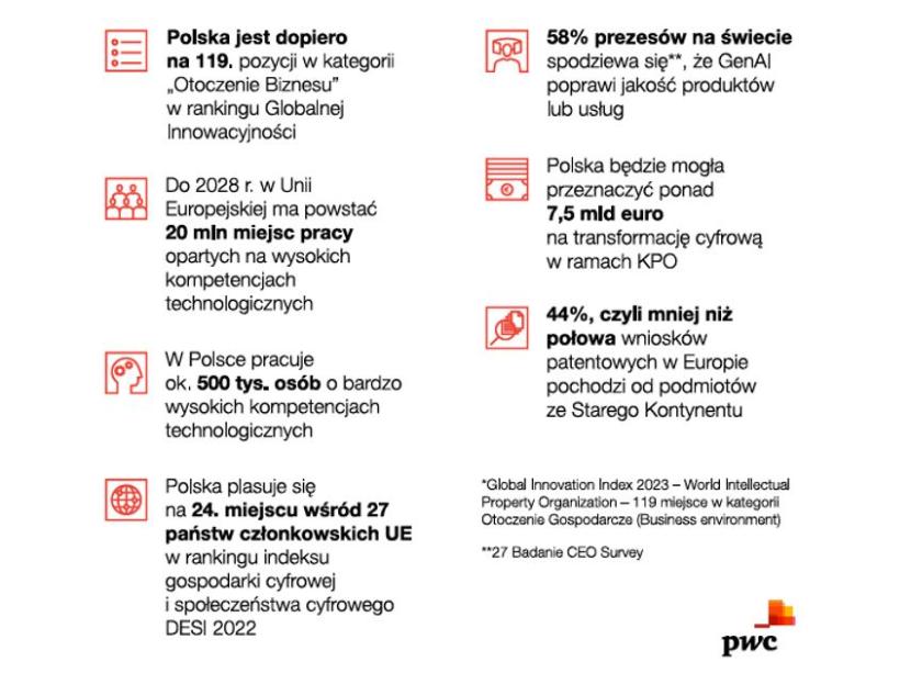 Cóż, AI nie wyręczy ludzi w stworzeniu dobrej strategii gospodarczej dla Polski ani w jej wdrożeniu. Sztuczna inteligencja nie przebiła się jeszcze do głównego nurtu debaty politycznej, np. tylko zdawkowo była omawiana przy okazji zeszłorocznych wyborów do Sejmu. Polska nie jest odosobniona. Z badania Edelman Trust Barometer, mierzącego globalne zaufanie do instytucji, wynika, że prawie 60 proc. pytanych sądzi, że rządy nie mają kompetencji do skoordynowania działań w taki sposób, który pozwoliłby dobrze wykorzystać potencjał AI i innych innowacyjnych technologii. Jak trudna to dziedzina, pokazały prace na poziomie Unii Europejskiej, zmierzające do uregulowania sztucznej inteligencji – żeby była tworzona w sposób odpowiedzialny i bezpieczny dla krajów, społeczeństw i obywateli. I trzeba to było poukładać tak, by Europa się technologicznie nie zmarginalizowała, nie została w tyle za Azją i Stanami Zjednoczonymi. A obawa jest poważna, bo to innowacyjność pozostaje słabą stroną europejskiej gospodarki. Większość wniosków patentowych rejestrowanych w Europie pochodzi spoza Starego Kontynentu. I choć kilka krajów, w tym Niemcy i Francja, próbuje to na własną rękę zmienić, to nadal dobrze zapowiadające się nowoczesne firmy uciekają do Stanów Zjednoczonych do Doliny Krzemowej, gdzie mają lepsze warunki.