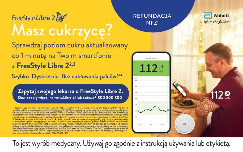 FreeStyle Libre 2 system monitorowania glikemii flash (czujnik), wyrób medyczny używany wraz ze zgodnym czytnikiem lub aplikacją do monitorowania poziomu glukozy w płynie śródtkankowym u osób z cukrzycą i zaprojektowany, aby zastąpić oznaczanie stężenia glukozy we krwi w samodzielnym kontrolowaniu cukrzycy, w tym w dawkowaniu insuliny. Producent: Abbott Diabetes Care Ltd., Upoważniony przedstawiciel: Abbott B.V., Reklamodawca: Abbott Laboratories Poland sp. z o.o. © 2024 Obudowa czujnika, FreeStyle, Libre oraz powiązane z nimi znaki są własnością firmy Abbott. Rozporządzenie Ministra Zdrowia z dnia 13 października 2023 r. zmieniające rozporządzenie w sprawie wykazu wyrobów medycznych wydawanych na zlecenie. FreeStyle Libre 2 – podręcznik użytkownika systemu. Testy z opuszki palca są konieczne w przypadku, gdy odczyty stężenia glukozy i alarmy nie są zgodne z występującymi objawami lub przeczuciami dotyczącymi poziomu glikemii. ADC-103433 v.1.0