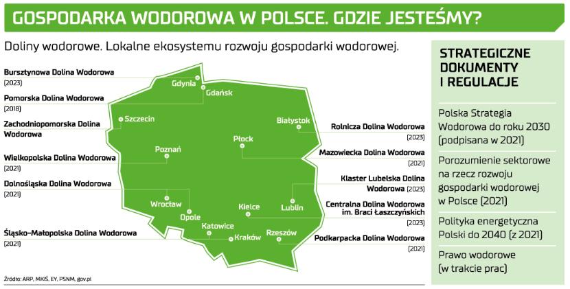 Rozwój gospodarki wodorowej w Polsce koncentruje się w kilku obszarach: energetyce, transporcie, przemyśle energochłonnym oraz petrochemii. Według wyliczeń Instytutu Energetyki – Państwowego Instytutu Badawczego, szacowana wartość dodana gospodarki wodorowej to ok. 343 mln - 870 mln euro w 2040 r., w zależności od poziomu popytu. Na przestrzeni ostatnich lat Polska rozpoczęła budowę filarów regulacyjnych. Nową drogę wytyczyła „Polska Strategia Wodorowa do roku 2030 z perspektywą do 2040 r.”, przyjęta w 2021 r. To kluczowy dokument, który zakłada np. powstanie instalacji do produkcji niskoemisyjnego wodoru o mocy 2 GW do 2030 r. Pojazdy wodorowe i stacje tankowania wodoru mają na stałe zagościć w polskim krajobrazie.
