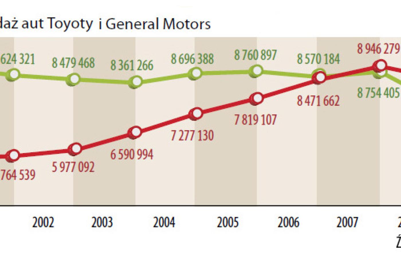 Jeszcze trzy lata temu takie upokorzenie byłoby nie do pomyślenia. W 2007 r. Toyota sprzedała prawie 9 mln aut, wyprzedzając General Motors, dotychczas największego producenta samochodów na świecie. Rok później wielką trójkę dobił kryzys – GM przeszedł bankructwo i faktyczną nacjonalizację, Ford zaliczył brutalną restrukturyzację, a Chrysler trafił w ręce Fiata. Wydawało się, że Toyota może na tym tylko skorzystać, ale stało się inaczej – w 2008 r. odnotowała pierwszą stratę od 58 lat, a w ostatnich miesiącach ujawniła całą serię wad fabrycznych w swoich samochodach, która zrujnowała wizerunek koncernu. Na dodatek Toyocie grozi fala pozwów – Kalifornia wytoczyła jej proces o świadome sprzedawanie konsumentom wadliwych aut, a właściciele Toyot żądają odszkodowań za spadek ich wartości, a także śmierć bliskich.