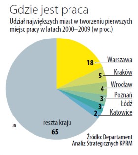 Z badań Departamentu Analiz Strategicznych Kancelarii Prezesa Rady Ministrów dowiadujemy się, że największe szanse na znalezienie pierwszej pracy są w Warszawie. W ostatnich dziesięciu latach tutaj właśnie znalazło ją aż 18 proc. zatrudnionych po raz pierwszy. Nie boją się też młodych: Kraków, Wrocław, Poznań, Łódź i Katowice. Poza dużymi miastami o pierwszą pracę jest naprawdę trudno. Absolwenci z Hrubieszowa czy Suwałk na etat w swoim mieście dużych szans nie mają. Jeśli starają się poprzez urząd pracy o staż, to muszą się w wybranym mieście zameldować.