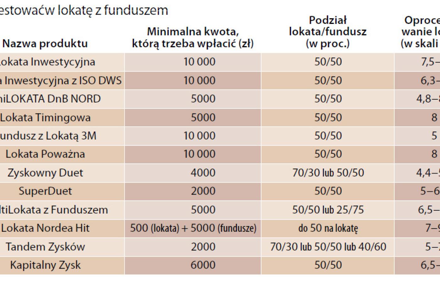 Czy wybrać mniejszy, ale pewny zysk na lokacie, czy może jednak podjąć ryzyko i stworzyć sobie perspektywę lepszego zarobku w funduszu inwestycyjnym? to chyba najczęstszy dylemat, z którym borykają się posiadacze zaskórniaków. Banki już dawno wpadły na pomysł, aby niezdecydowanym klientom zaoferować obie metody oszczędzania łącznie. I tak powstały specjalne lokaty z funduszem, w których wpłacane pieniądze dzielone są na dwie, najczęściej równe, części.
