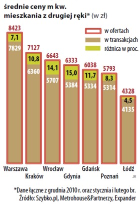 Większość pośredników w obrocie nieruchomościami uważa, że ceny mieszkań z drugiej ręki nie odpowiadają ich wartości, są przez właścicieli zawyżone – wynika z badań Polskiej Federacji Rynku Nieruchomości. Najbardziej (nawet do 35 proc.) przeszacowane są lokale o powierzchni do 30 m kw. Czasy, kiedy takie mieszkania były rozchwytywane, minęły. Nawet one czekają teraz na kupca od 3 do 6 miesięcy. Mieszkania o powierzchni ponad 50 m kw. sprzedawane są średnio w ciągu 15 miesięcy. – Bardzo trudno jest przekonać klienta do urealnienia ceny. Głównie dlatego, że naganiacze z biur nieruchomości – żeby tylko podpisać umowę – godzą się na każdą propozycję cenową właścicieli – narzeka krakowski pośrednik Marek Urban. Po wielu miesiącach właściciel przekonuje się, że bez obniżenia ceny mieszkania jednak nie sprzeda.