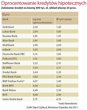 O ile franki są już mało popularne (w IV kwartale 2010 r. udzielono w nich tylko 6 proc. wszystkich kredytów hipotecznych), to euro pozostaje atrakcyjne, zwłaszcza dla potrzebujących dużej pożyczki. Powód jest prosty i niezmienny – zdecydowanie niższe stopy w strefie wspólnej waluty niż w Polsce. A to oznacza, że nawet mimo wyższych marż średnie oprocentowanie kredytów w euro jest o ok. 2 punkty proc. niższe. Wszystko wskazuje na to, że pożyczki w euro i frankach pozostaną na naszym rynku, choć wkrótce mogą się stać jeszcze trudniej dostępne.