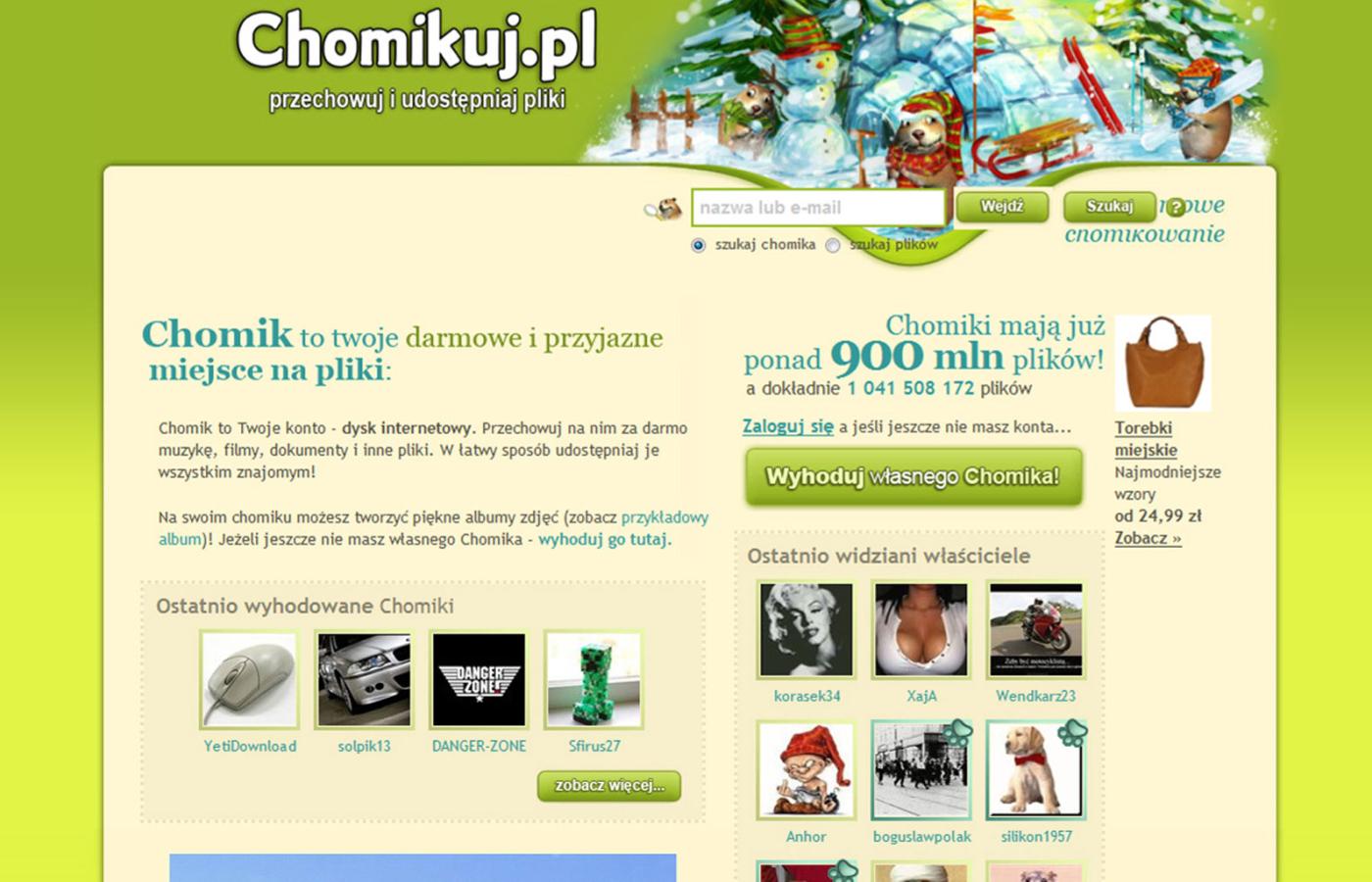 Honorowanie twórców tych dzieł przez portal nie jest przewidziane. 20 stycznia 2012 r. łączna liczba plików zachomikowanych, czyli skopiowanych na serwery przez użytkowników portalu chomikuj.pl, przekroczyła miliard. (Dla porównania – wszyscy wydawcy w Polsce sprzedali w zeszłym roku najwyżej 200 mln egzemplarzy książek). Chomikuj.pl jest dziś 13 stroną pod względem popularności w Polsce. Widzimy tu kolekcjonerów, którzy dla samej przyjemności dzielenia się swoim szczęściem wystawiają świetne kolekcje filmów przedwojennych. Są bibliotekarze, którzy umieszczają książki w sieci, bo tak rozumieją edukację obywatelską. Widzimy wyścigowców, którzy potrafią pojechać do innego kraju, żeby na sali kinowej nakręcić „z partyzanta” i wpuścić do swojej norki film przed premierą w Polsce.