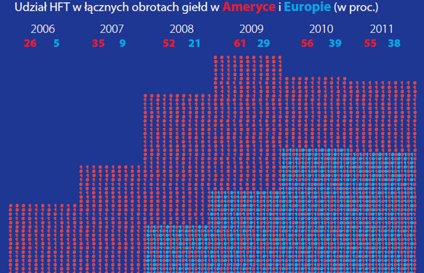 Ale samej zmiany technologicznej nie da się już odwrócić – nawet w Europie udział HFT w łącznym obrocie giełdowym sięga już 38 proc. W marcu ruszył handel błyskawiczny na obligacjach państw Unii Europejskiej. Kryzys wspólnej waluty wytwarza mnóstwo wahań kursowych, czyli okazji do zarobienia paru eurocentów. Po każdym szczycie w sprawie ratowania Grecji można obstawić Portugalię albo Hiszpanię.