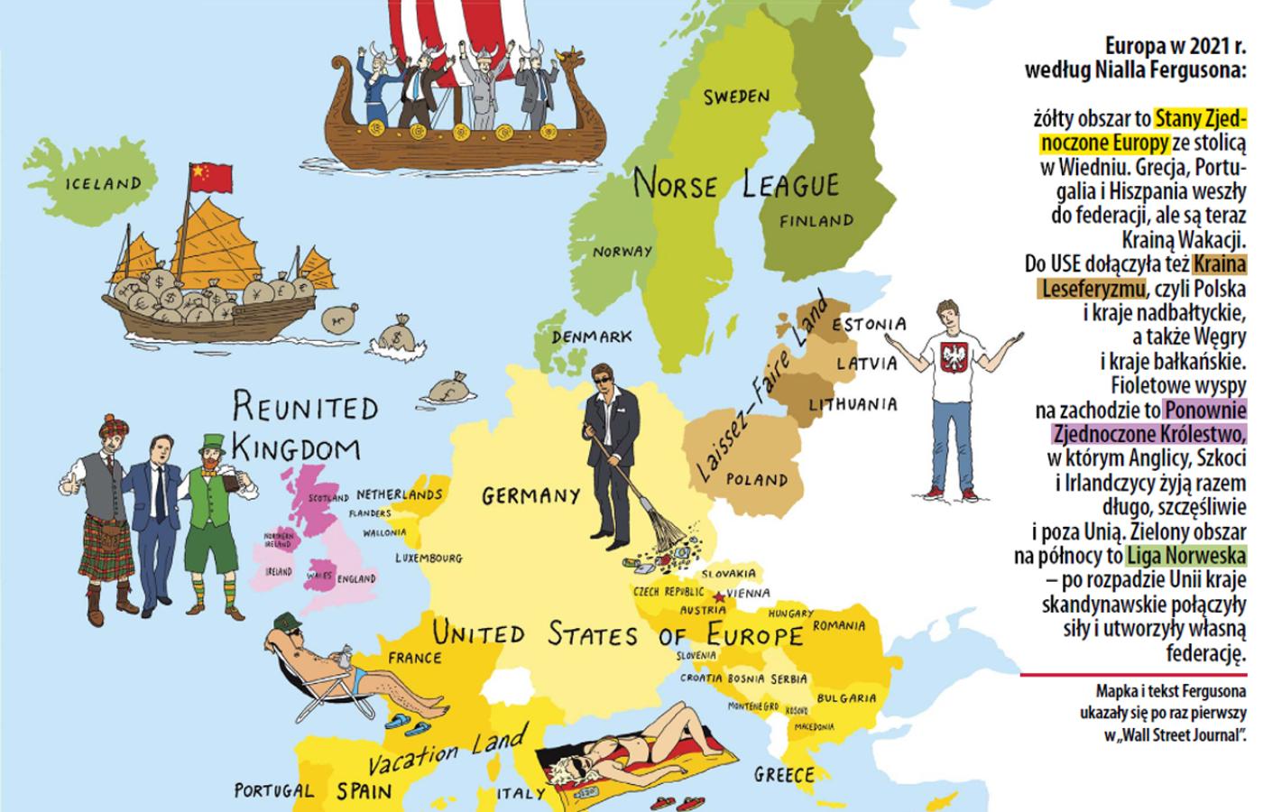 Pół roku temu brytyjski historyk Niall Ferguson uraczył świat wizją Europy w 2021 r. Przy satyrycznym tekście w „Wall Street Journal” znalazła się stosowna mapka: kilka lat po kryzysie niemal cały kontynent zajmują Stany Zjednoczone Europy. Niemcy pogodzili się z transferami na biedne południe, a Włosi – z najazdem turystów z bogatej północy. Na stolicę USE wybrano Wiedeń. Tylko w górze mapy widać dwa odrębne byty: Ponownie Zjednoczone Królestwo Wielkiej Brytanii i Irlandii oraz Unię Norweską, złożoną z krajów skandynawskich i Islandii. Polska, rządzona przez Radka Sikorskiego, leży w Krainie Leseferyzmu, która właśnie przystąpiła do Stanów. Główny wniosek Fergusona: strefa euro zamieni się w federację, Unia Europejska ulegnie rozpadowi.