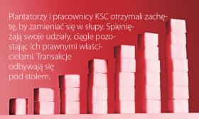 Przy ostatniej próbie prywatyzacji uprawnionych do zakupu udziałów było 18 tys. osób. Ponad 16 tys. plantatorów i około 2 tys. pracowników. Gdyby uznać, że KSC warta jest rzeczywiście 3 mld zł, każdy z uprawnionych, średnio, musiałby się liczyć z wydatkiem około 150 tys. zł. Nie ma mowy ani żeby tyle mieli, ani żeby chcieli aż tyle wydać. Gotowość zakupu udziałów zgłosiło niecałe 12 tys. osób. Grono to chciało wejść w posiadanie 40 proc. oferowanych akcji. Pakiet kontrolny nadal więc pozostawałby w rękach państwa, które obecnie ma 80 proc. walorów spółki. To druga przyczyna wstrzymania prywatyzacji.