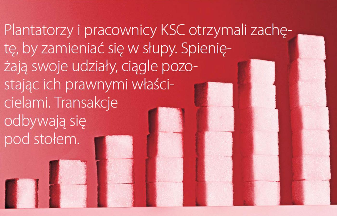 Dlatego mecenas Andrzej Żebrowski, którego kancelaria przygotowywała pierwszy prospekt emisyjny dla KSC, uważa, że spółka może się sprywatyzować według innego scenariusza. W pierwszym etapie będzie tak, jak chcą plantatorzy – każdy z uprawnionych będzie mógł kupić proporcjonalnie tylko tyle akcji, ile wynika z ilości dostarczanych przez niego do cukrowni buraków. W drugim spośród kilkunastotysięcznego grona nabywców wyłoni się grupa 20–30 osób, które będą miały wystarczającą siłę finansową, by przejąć kontrolę nad spółką. W kolejnym podejściu może się okazać, że wystarczy już nawet kilkaset milionów złotych. Jest na wsi wielu bogatych przedsiębiorców, najczęściej byłych lub obecnych polityków, którzy już się dorobili. Do kolejnej prywatyzacji KSC przystąpią we własnym imieniu jako np. plantatorzy buraków albo znajdą sobie zaufane słupy. To oni wyłonią potem zarząd, rozdawać będą intratne kontrakty i zarabiać krocie na niebywale drogim cukrze. Na razie czekają na atrakcyjną cenę spółki.