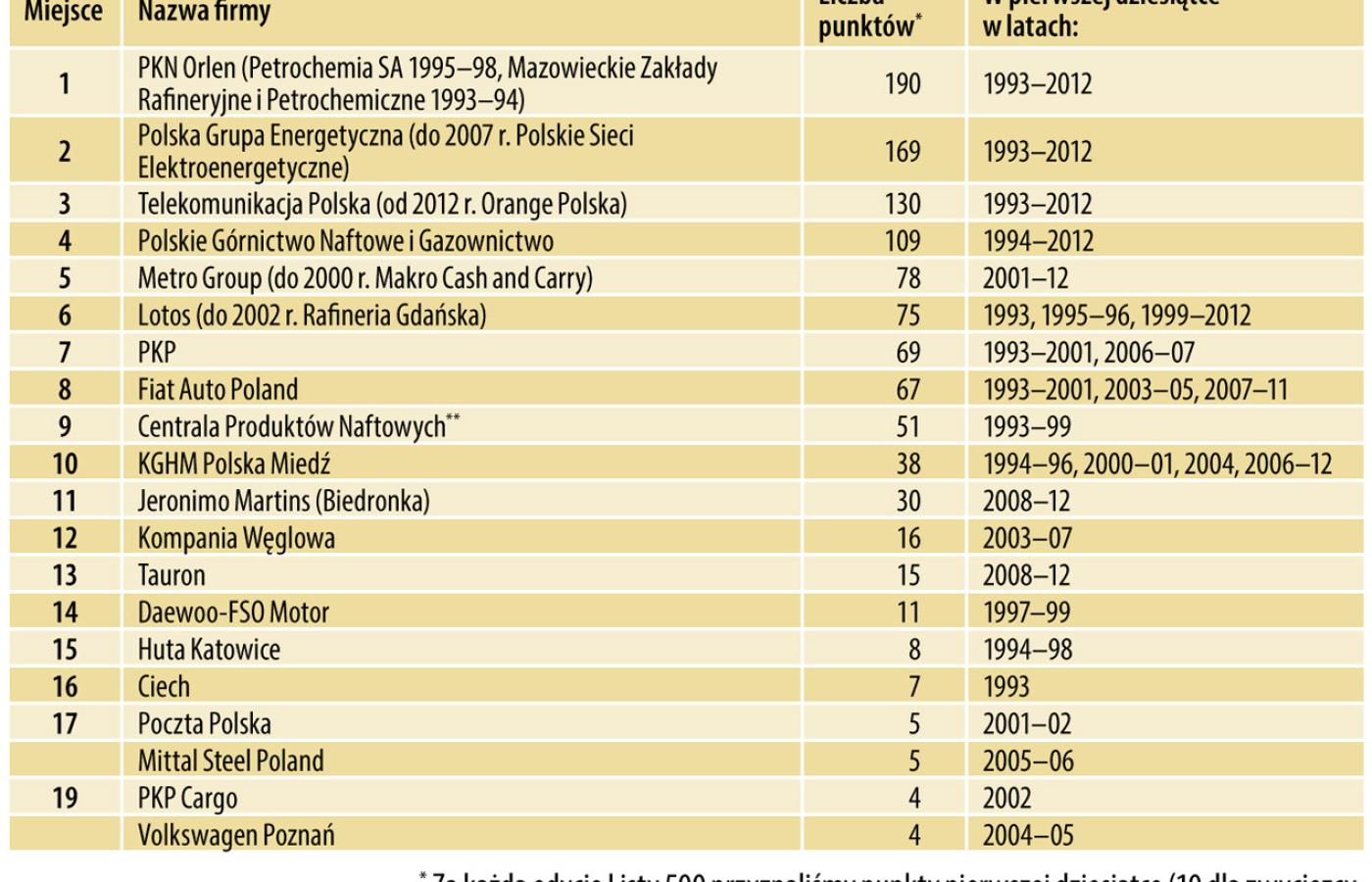 To właśnie ten gigant lideruje Pięćsetce nieprzerwanie od 1999 r. i nic nie wskazuje na to, żeby komukolwiek szybko udało się go strącić ze szczytu. Tylko jeden jedyny raz w historii naszego rankingu spółce spoza branży paliwowej udało się zająć pierwsze miejsce. Było to w 1998 r., gdy największe przychody wykazały Polskie Sieci Elektroenergetyczne. Wykorzystały moment przekształceń w sektorze paliwowym, ale już nigdy więcej tej zdobyczy nie powtórzyły. Jednak PSE, występujące od 2007 r. jako Polska Grupa Energetyczna, mogą zdobyć nagrodę w innej kategorii. To najbardziej stabilny gigant w historii Listy 500, obecny od samego początku w pierwszej trójce! Inną potęgą, prawie zawsze lokującą się w czołowej dziesiątce, jest Polskie Górnictwo Naftowe i Gazownictwo, zazwyczaj w okolicach 3–5 miejsca.