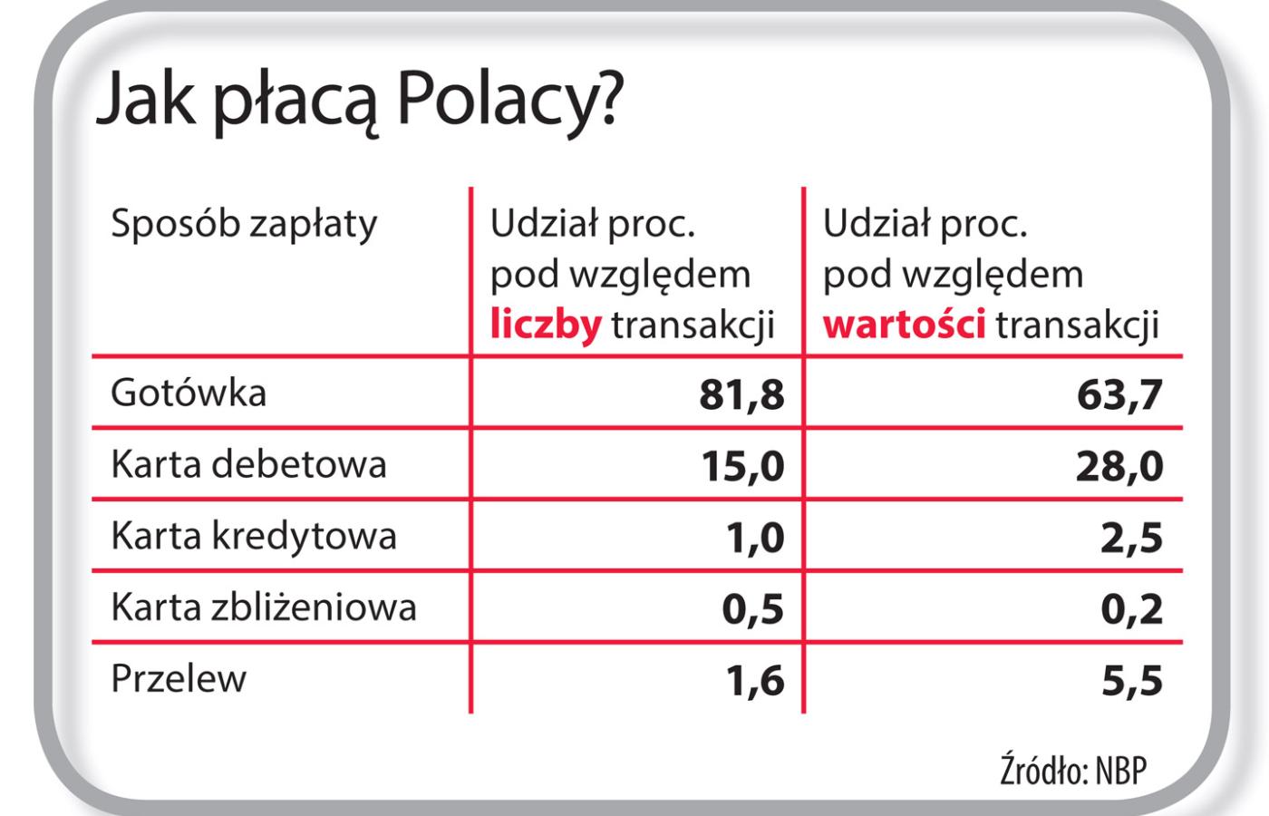Głównym winowajcą jest wysoka od lat opłata interchange pobierana przez banki, a potem w dużej części przekazywana organizacjom kartowym (to głównie Visa i MasterCard). Do niej dochodzą jeszcze inne, pomniejsze obciążenia, jak prowizja agenta rozliczeniowego, a często także koszt dzierżawy terminala. Jednak to właśnie interchange wzbudza największe kontrowersje, bo – jak na Europę – przez lata był w Polsce wyjątkowo wysoki. Do niedawna wynosił 1,6–1,7 proc. wartości każdej transakcji, teraz spadł do ok. 1,2–1,3 proc., ale to i tak grubo powyżej europejskiej średniej. Dla klientów interchange pozostaje zazwyczaj niewidoczny, bo w większości sklepów ceny przy płaceniu kartą są takie same jak przy płaceniu gotówką.