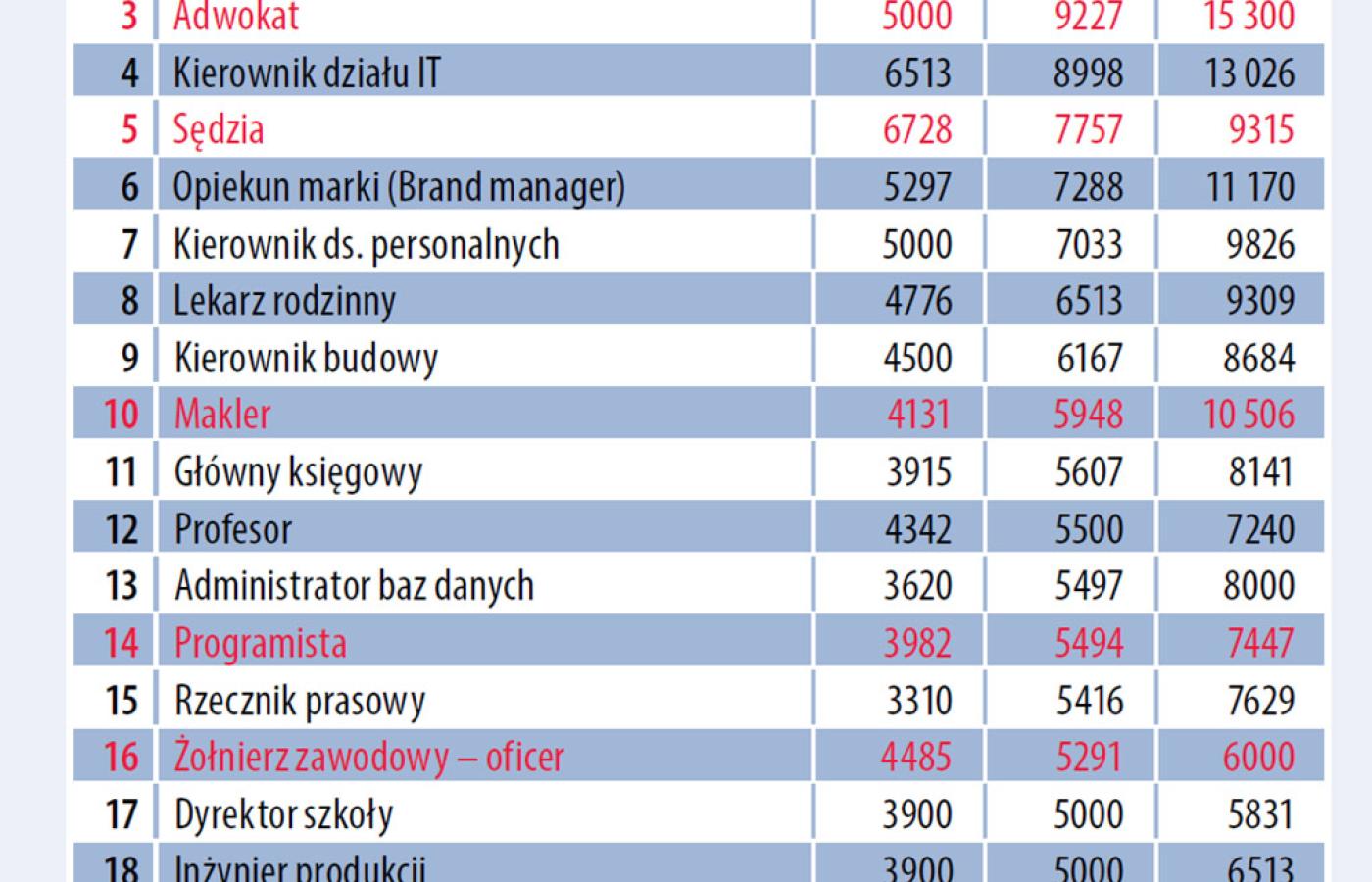 Programista. (14) Wynagrodzenie bardzo uzależnione jest od znajomości języków programowania. Najniżej wyceniana jest praca w języku php (używanym do tworzenia stron internetowych) – 4–4,5 tys. zł. Programiści systemowi języków wysokiego poziomu (zwłaszcza Python) mogą liczyć na najwyższe wynagrodzenia.