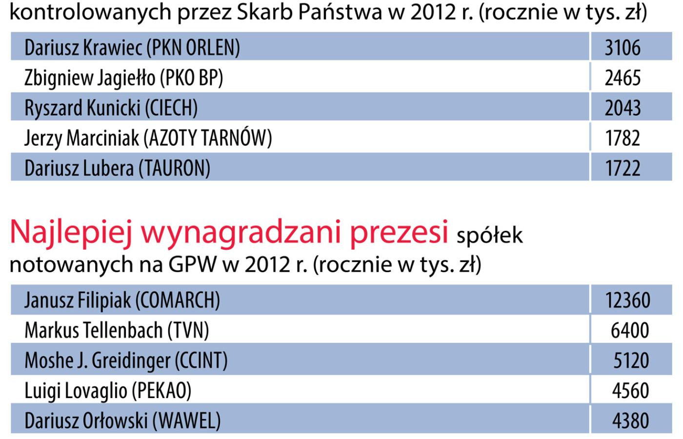 Na liście najlepiej wynagradzanych prezesów w 2012 r. pierwsze miejsce zajął prof. Janusz Filipiak, prezes Comarchu. Zarabiał prawie 12 mln zł, czyli milion miesięcznie! To wywołało spore wrażenie, a sam Filipiak musiał się ze swoich zarobków gęsto tłumaczyć w „Gazecie Wyborczej”. Pod wrażeniem jest też prof. Robert Gwiazdowski, prezydent Centrum im. Adama Smitha i ekspert podatkowy. Jemu akurat zaimponowała nie tyle wysokość uzyskiwanych dochodów, ale sam fakt, że Filipiak, który wraz z żoną mają pakiet kontrolny w Comarchu, płaci sobie jako prezesowi wynagrodzenie. Rzadko który znany biznesmen we własnej firmie pobiera pensję. Jeżeli już, to taką, która nie będzie kłuła w oczy, a w razie czego pozwoli wyjąć PIT i go pokazać.