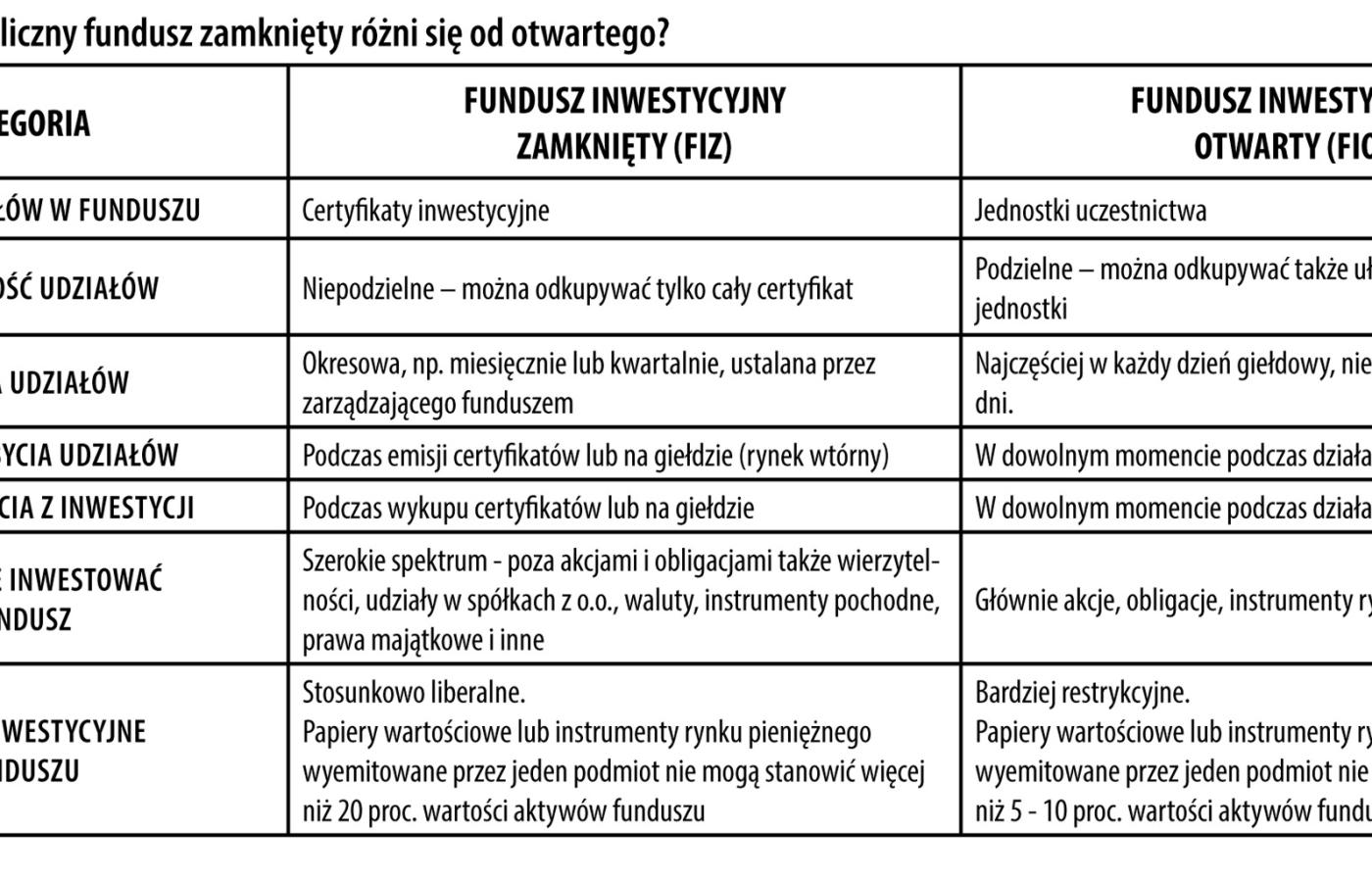 Jaka jest najważniejsza różnica między funduszem otwartym a zamkniętym? W tym pierwszym nabywa się jednostki uczestnictwa. Można to zrobić najczęściej w każdy dzień giełdowy. Tak samo łatwo da się je odkupić. Tymczasem fundusz zamknięty ma nieco bardziej restrykcyjne zasady. Emituje on certyfikaty inwestycyjne, a nie jednostki uczestnictwa. Certyfikat można nabyć w czasie subskrypcji, trwającej zazwyczaj kilka tygodni. Gdy fundusz zamknięty rozpocznie działalność, będzie on wykupywał certyfikaty nie codziennie, a tylko w określonych momentach.