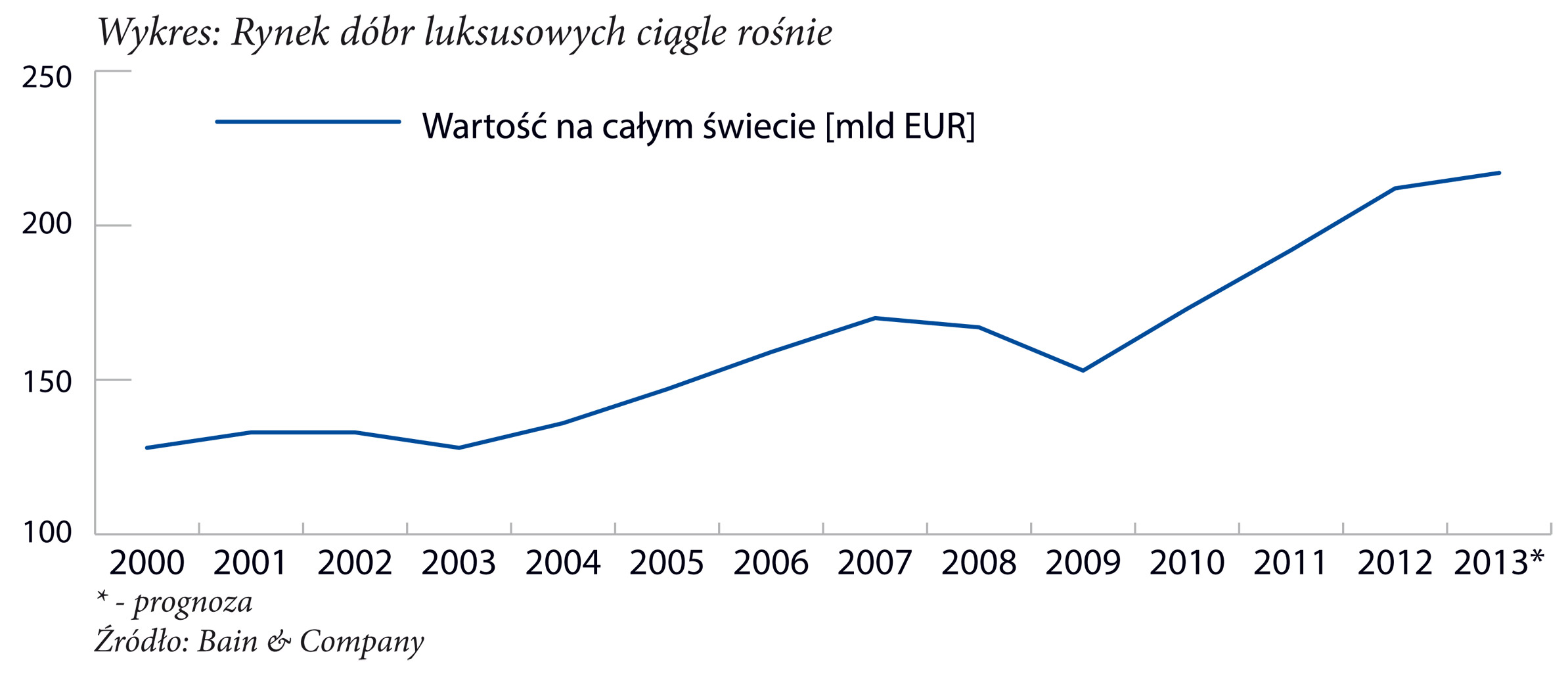 Tej branży kryzys nie dotyczy. Wartość sprzedawanych na świecie dóbr luksusowych nieustannie rośnie. Co ważne, dzieje się tak nie tylko za sprawą nowej klasy średniej w Chinach, Indiach czy Brazylii, ale także dzięki bogatym krajom Europy i Ameryki. Według badań firmy Bain & Company w tym roku rynek dóbr luksusowych osiągnie wartość 217 mld euro. Ta kategoria obejmuje wyroby skórzane, buty, odzież, perfumy, kosmetyki, biżuterię i zegarki – wszystko oczywiście najwyższej jakości i od najbardziej uznanych producentów.