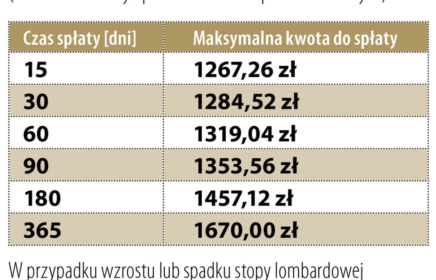 W przypadku chwilówek branych na miesiąc limit wyniesie ok. 28,5 proc. Czyli pożyczający tysiąc złotych będzie musiał oddać nie więcej niż 1285 zł. Im dłuższy czas spłaty, tym limit będzie wyższy. Przy pożyczce na pół roku firma będzie mogła zażądać łącznie prawie 46 proc. odsetek, a przy rocznej – 67 proc. W przypadku pożyczek zaciąganych na kilka lat pojawi się dodatkowe ograniczenie. Łączne opłaty nie będą mogły przekroczyć 100 proc. kwoty pożyczki, powiększonej o czterokrotność stopy lombardowej NBP za każdy rok. W tej chwili stopa lombardowa wynosi 3 proc. rocznie. Co to oznacza dla klientów?