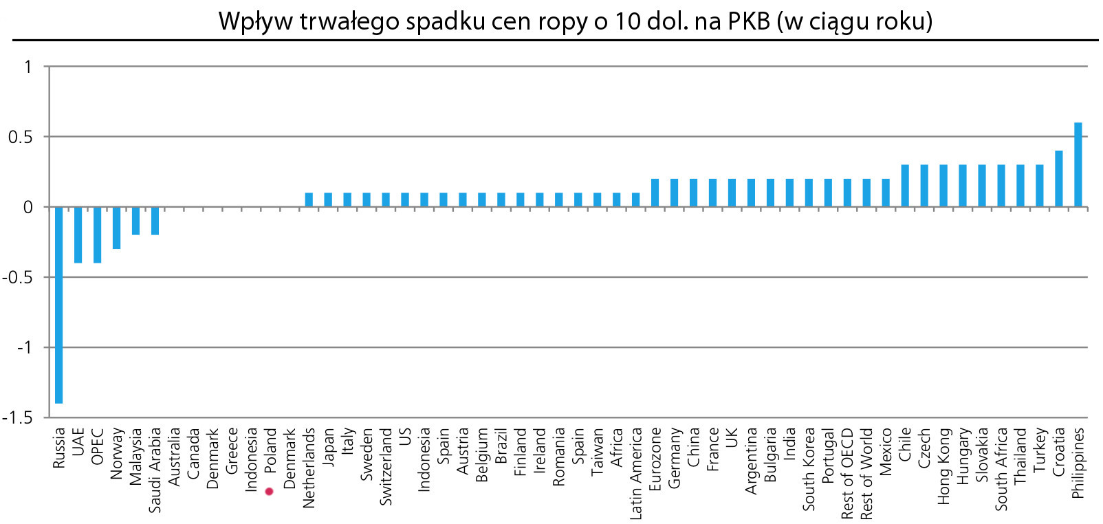 Polska jest w środku stawki. Z jednej strony nie jesteśmy potentatem naftowym, a z drugiej – wykorzystujemy stosunkowo niewiele ropy. Przemysł jest w większości oparty na węglu, a gospodarstwa domowe produkty z ropy naftowej kupują głównie na stacjach paliw. W przeciwieństwie do innych krajów w niewielkim stopniu do ogrzewania mieszkań stosujemy olej opałowy – ten przegrywa rywalizację z gazem czy węglem. Dlatego tempo wzrostu PKB w Polsce jest słabo zależne od wahań cen ropy.