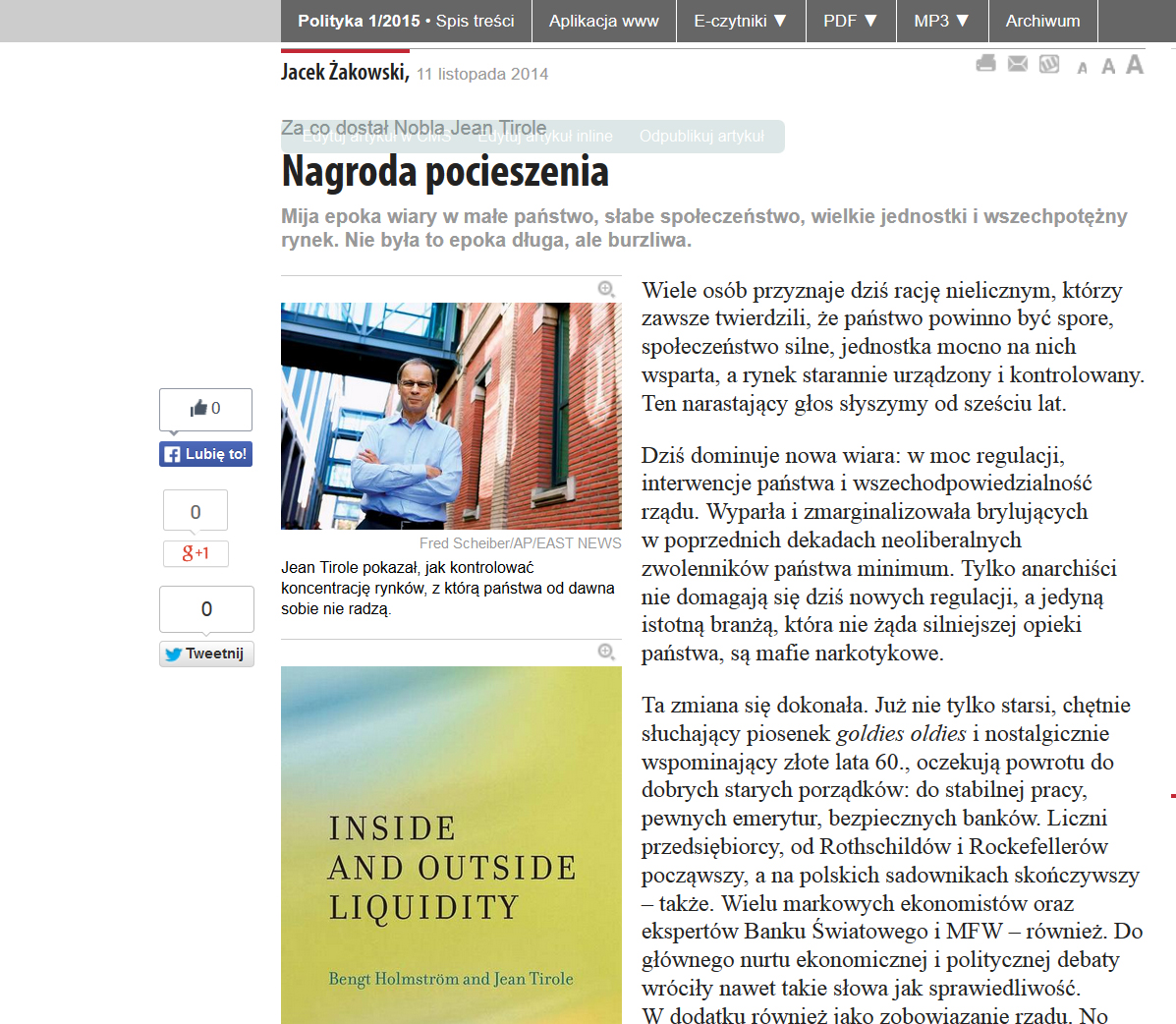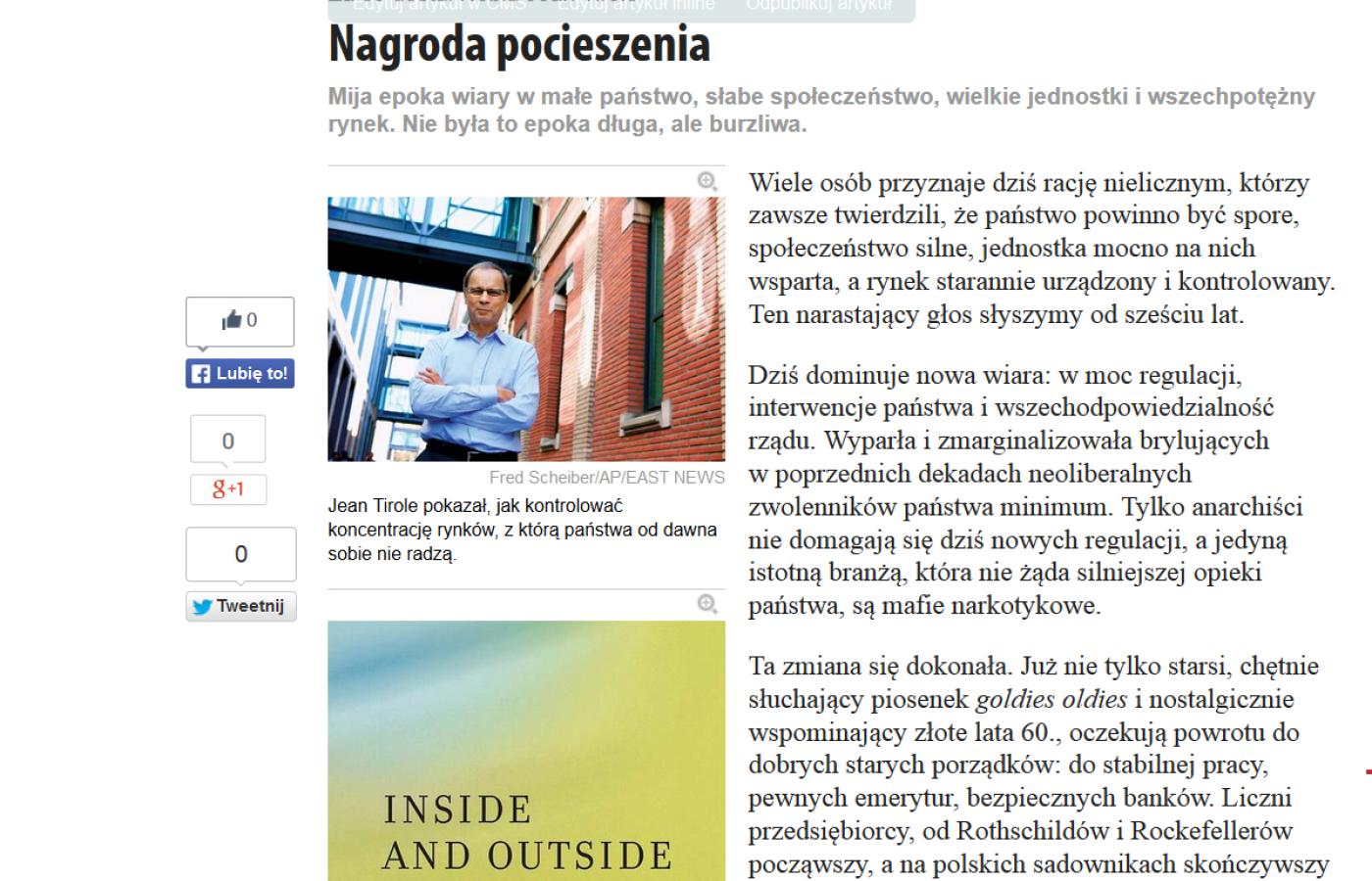 W artykule Jacka Żakowskiego „Nagroda pocieszenia” (POLITYKA nr 46/14) pojawiło się istotne nieporozumienie. Autor artykułu sugeruje, że laureat Nagrody Banku Szwecji im. Alfreda Nobla w dziedzinie ekonomii Jean Tirole jest wielkim zwolennikiem regulacji gospodarek, a nawet wręcz teoretykiem obecnej antyliberalnej krucjaty. Dobrze się więc stało, że Komitet Noblowski przyznał nagrodę pocieszenia tej krucjacie. Tymczasem prace Tirole’a mają matematyczno-ekonomiczny, zupełnie neutralny i wręcz techniczny charakter. Tak samo jak prace co najmniej kilkunastu innych noblistów z ostatnich lat, z którymi tegoroczny laureat często mówi jednym głosem – nawet we wspólnych publikacjach. Oznaczałoby to więc, że Komitet Noblowski permanentnie przyznaje w ekonomii nagrody pocieszenia nieświadomym tego badaczom. W swoich pracach J. Tirole nie tyle propaguje regulację, co poszukuje liberalnych sposobów redukcji asymetrii informacji między niezależnymi od rządów regulatorami a przedsiębiorstwami na niektórych rynkach, które tradycyjnie uważa się za tzw. naturalne monopole. W rzeczywistych gospodarkach takich monopoli jest coraz mniej z ewidentnymi korzyściami dla gospodarstw domowych. Gdyby doszukiwać się ideologicznych konsekwencji w pracach Tirole’a, to bardziej można by je znaleźć w obronie pozycji wielkiego kapitału w gospodarce: lepiej być regulowanym, zwłaszcza w tak liberalny i negocjacyjny sposób przez niezależnego regulatora, jak proponuje Tirole, niż stracić pozycję na rynku na rzecz nowych i efektywniejszych konkurentów.