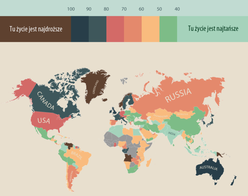 Tak powstał Consumer Price Index (Indeks cen konsumenckich). Każdemu państwu świata przydzielono określoną liczbę punktów – i zestawiono je z cenami Nowego Jorku. Przykładowo: jeśli dany kraj otrzymał w klasyfikacji 70 punktów, to znaczy, że koszty życia w tym rejonie są 30 proc. niższe niż w Nowym Jorku.