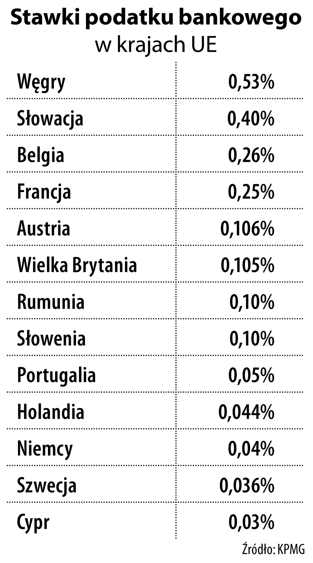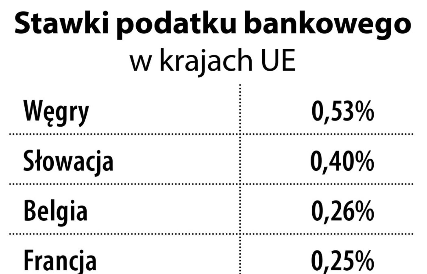 Obecnie podatek bankowy istnieje w 13 krajach Unii Europejskiej. Każdy kraj ma własną stawkę – najwyższą Węgry (0,53 proc.) i Słowacja (0,4 proc.), a najniższą Szwecja (0,036 proc.) i Cypr (0,03 proc.). Przy czym niektóre kraje nakładają mniejsze obciążenia na mniejsze banki. Różne w różnych krajach są też podstawy opodatkowania. Najwięcej państw za podstawę do naliczania podatku przyjmuje aktywa minus kapitał Tier 1 (wartość wyemitowanych przez bank akcji i obligacji długoterminowych) i gwarantowane depozyty klientów.