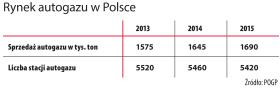 Trzy czwarte tonażu gazu propan-butan (czyli LPG) sprzedawane jest do napędzania samochodów. W butlach sprzedawane jest 13 proc. tonażu gazu, zaś w zbiornikach 12 proc. Autogaz oferowany jest na blisko 5,5 tys. stacji. Na koniec 2015 r. było ich 5420, o 40 mniej niż rok wcześniej.