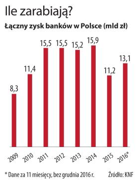 Spadające stopy procentowe oznaczały, że banki mniej też zarabiają na odsetkach od kredytów. Do tego coraz większymi kwotami trzeba było wspomagać Bankowy Fundusz Gwarancyjny, który wypłaca pieniądze klientom upadłych SKOK i banków spółdzielczych. Fatalna okazała się szczególnie końcówka 2015 r., gdy upadł spółdzielczy SK Bank, a reszta instytucji finansowych musiała szybko zorganizować dwumiliardową zrzutkę. W efekcie banki w tymże roku zarobiły łącznie „tylko” 11,2 mld zł, czyli prawie 5 mld mniej niż rok wcześniej. A potrzebują zysków nie tylko dla akcjonariuszy.