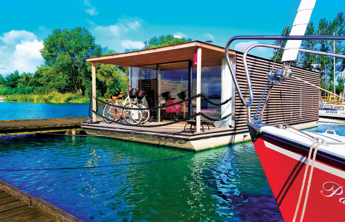 Marcin Baranowski, inżynier, właściciel firmy, która od lat stawiała nad morzem obiekty hydrotechniczne z betonu, swój pierwszy wodny domek zbudował w 2012 r. z myślą o synach, adeptach żeglarstwa. Gdy dla ich klubu zabrakło siedziby na lądzie, dzieciaki nie miały się gdzie schronić w przerwach pomiędzy treningami. Nim domek powstał, pomieszczenia klubowe wróciły na ląd, a Baranowski doszedł do wniosku, że w Mielnie na przymorskim jeziorze Jamno stworzy pływający hotel. W sumie zaprojektował i zbudował (ma niedaleko małą stocznię) 10 modeli domów (20–100 m kw.), które tworzą kompleks hotelowy (śniadania są co rano donoszone w koszach).