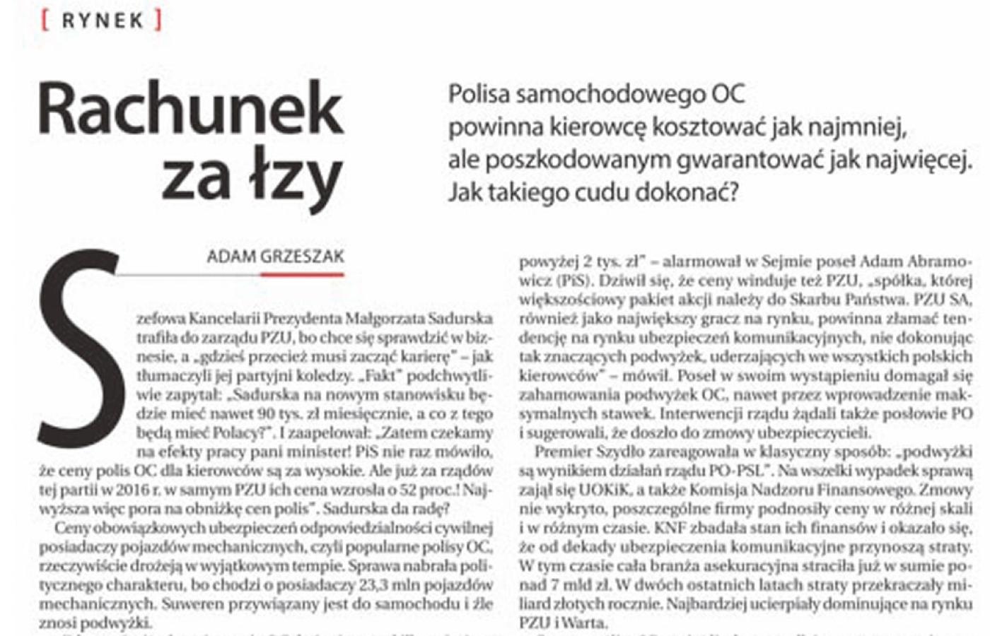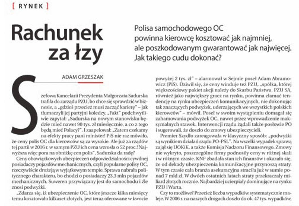 W artykule „Rachunek za łzy” (POLITYKA 30) Adam Grzeszak poruszył m.in. temat ustawowego uregulowania zadośćuczynień. Nasza Izba widzi tu poważne zagrożenia dla osób poszkodowanych. Firmy ubezpieczeniowe postulują wprowadzenie sztywnych ram wysokości zadośćuczynień. Przedstawiają sprawę tendencyjnie, powołując się na rozwiązania obowiązujące w nielicznych państwach, gdzie takie przepisy funkcjonują, omijając pokazanie tych państw, w których nikt o takich rozwiązaniach nie słyszał. Niestety, w całej tej dyskusji zapominają o osobach poszkodowanych i ich rodzinach. W aktualnym stanie prawnym, dzięki wywalczonym zadośćuczynieniom, ci poszkodowani mają szansę powrócić do normalnego życia.