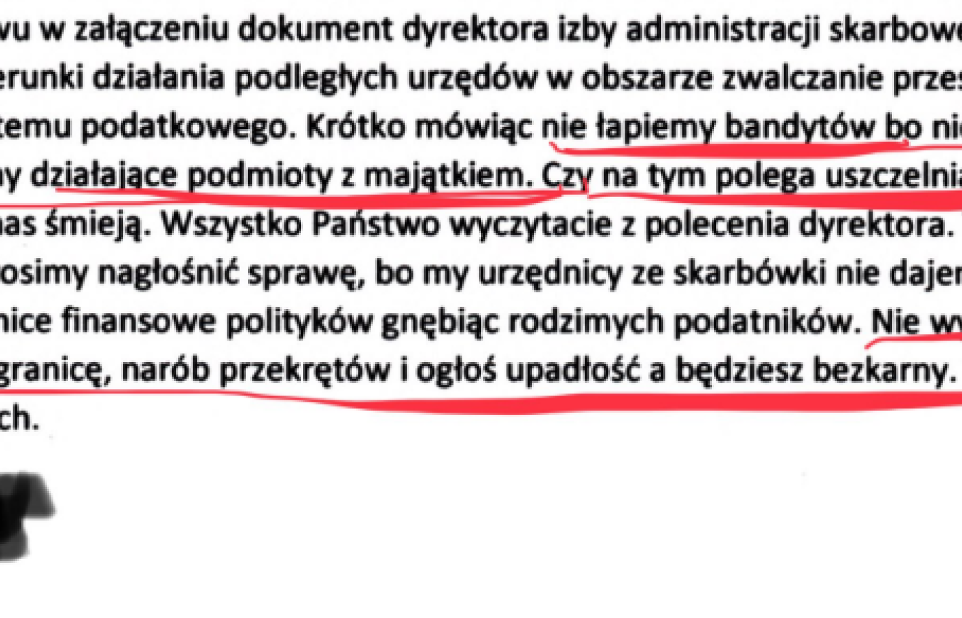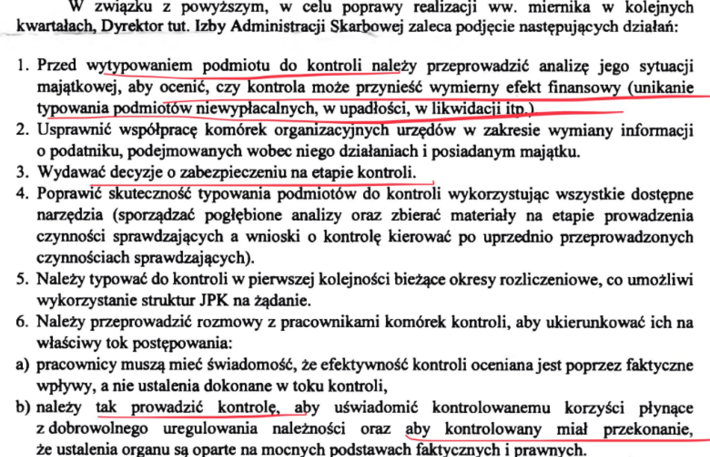 I dalej: „Pracownicy muszą mieć świadomość, że efektywność kontroli oceniana jest poprzez faktyczne wpływy, a nie ustalenia dokonane w toku kontroli”. W skrócie: zabierajcie się za przedsiębiorców prowadzących realną działalność, bo od nich da się wydusić kasę. A przestępców, słupy i innych takich zostawcie w spokoju, i tak na nich nie zarobimy.