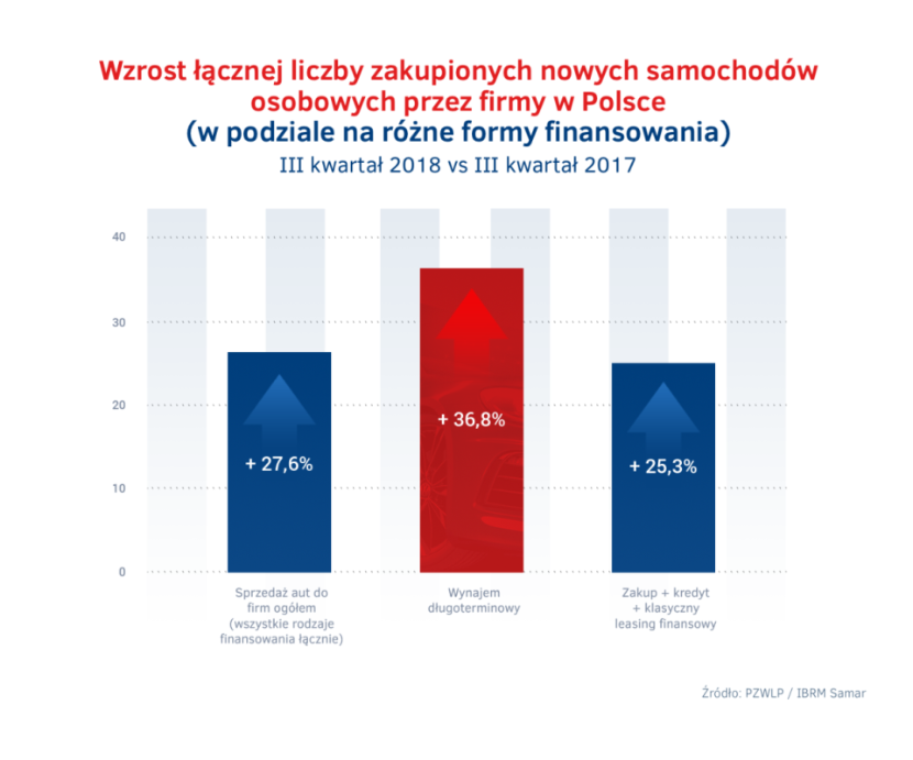 Branża wynajmu długoterminowego zakupiła w trzecim kwartale o 36,8% więcej nowych samochodów osobowych niż w tym samym okresie rok wcześniej, rozwijając się dzięki temu znacznie szybciej od konkurencyjnych form finansowania pojazdów służbowych. Dla porównania, z wykorzystaniem zakupu aut ze środków własnych, na kredyt i klasycznego leasingu finansowego razem, wzrost sprzedaży był wysoki, ale nadal znacznie niższy niż ten odnotowany przez wynajem długoterminowy, gdyż wyniósł 25,3%.