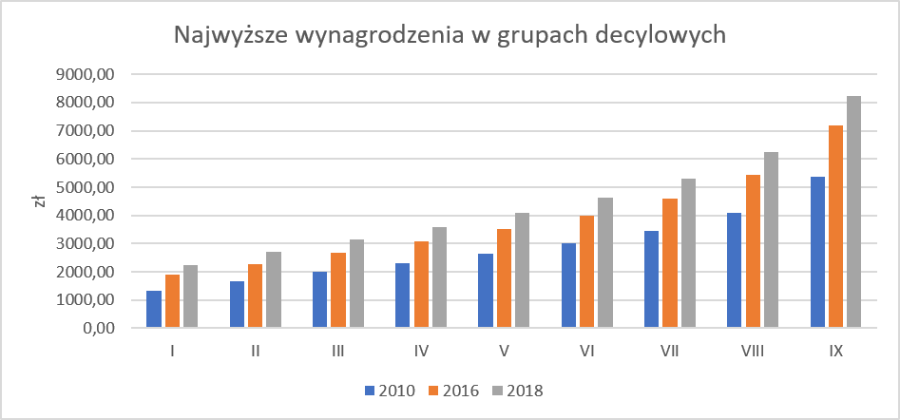 Spojrzenie na wynagrodzenia w grupach decylowych prowadzi do wyrazistszych wniosków. Gdyby uszeregować pracowników od zarabiających najmniej do najlepiej wynagradzanych, to 10 proc. od góry stanowi pierwszą grupę decylową, między 10 a 20 proc. jest druga grupa decylowa itd. W 2018 r. wynagrodzenia w pierwszym i drugim decylu były o 18 proc. wyższe niż w 2016, podczas gdy płace w dziewiątej grupie wzrosły tylko o 14 proc.