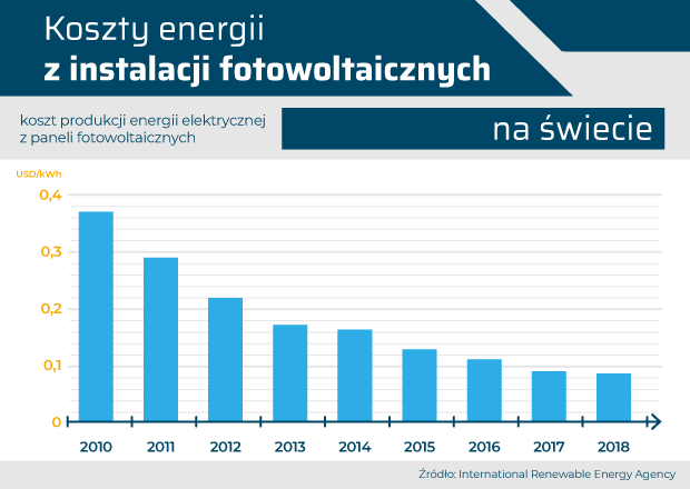 Produkcja paneli fotowoltaicznych nieustannie rośnie (obecnie produkuje się ich sto razy więcej niż przed 2010 rokiem), a każde podwojenie produkcji oznacza spadek ich ceny średnio o 20%.
