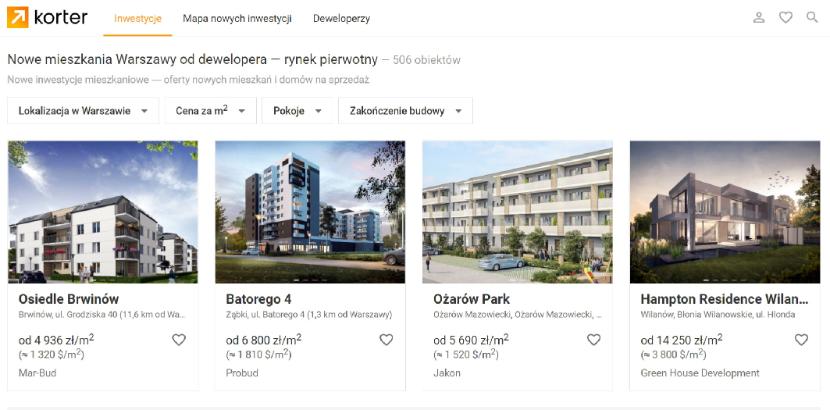 Przed dokonaniem właściwego wyboru należy zapoznać się z całym zarysem rynku nieruchomości ― wygodnie jest to zrobić na portalu inwestycji mieszkaniowych Korter. Narzędzie to pozwala na porównanie cen mieszkań w najróżniejszych lokalizacjach Polski oraz zapoznanie się z najważniejszą informacją dotyczącą wybranych przez nas inwestycji.