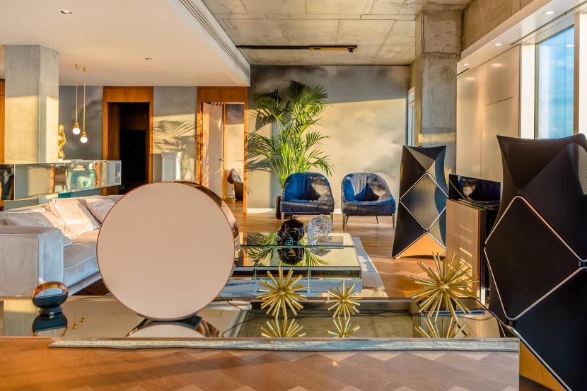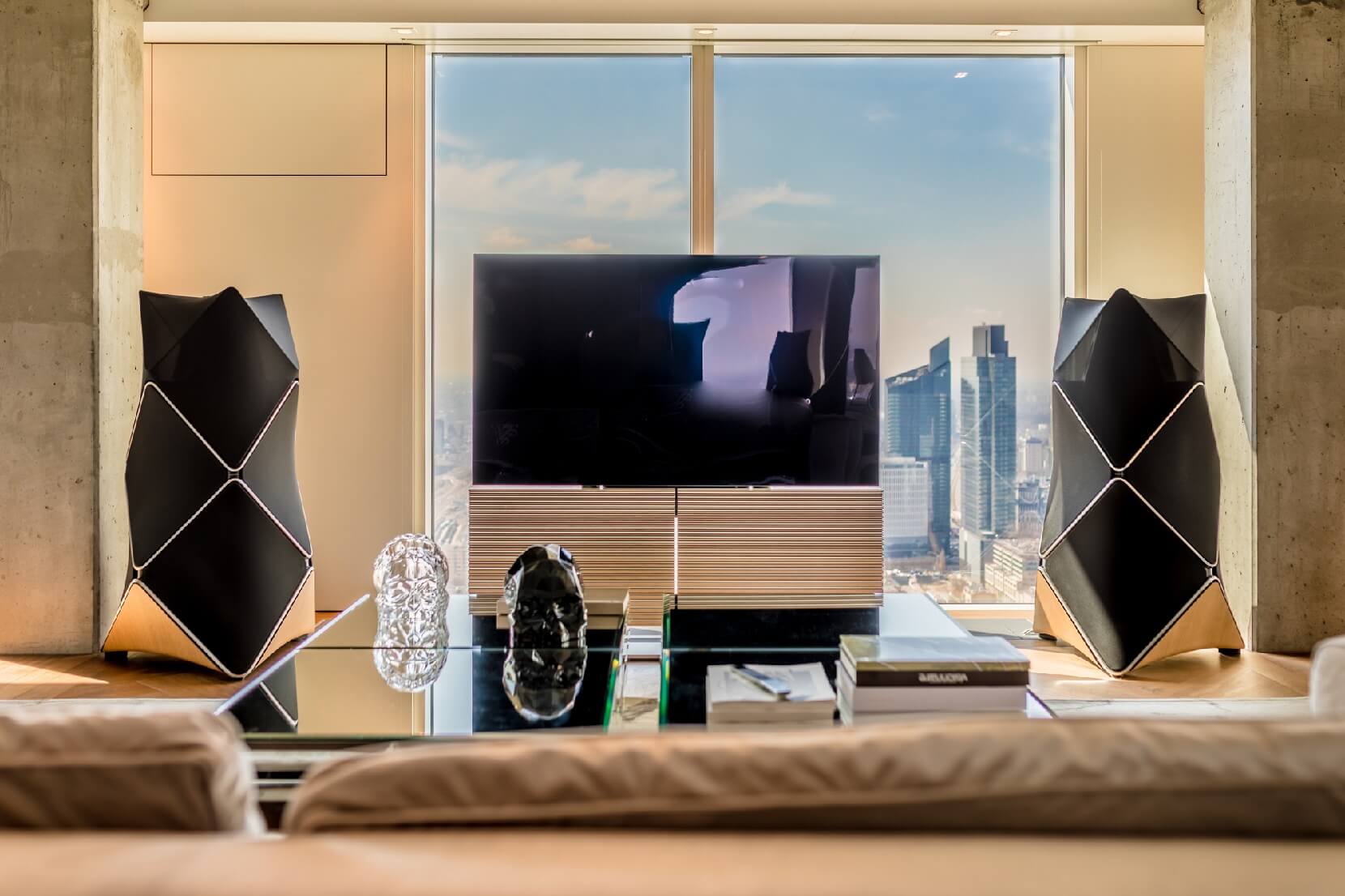 Zainstalowany system BeoLink Mulitroom pozwala doświadczyć przejmujących dźwięków we wszystkich pokojach apartamentu. W każdym z pomieszczeń prezentowany jest jeden z głośników gamy Flexible Living, z których każdy jest wyjątkowy w kwestii designu oraz właściwości muzycznych i technologicznych.