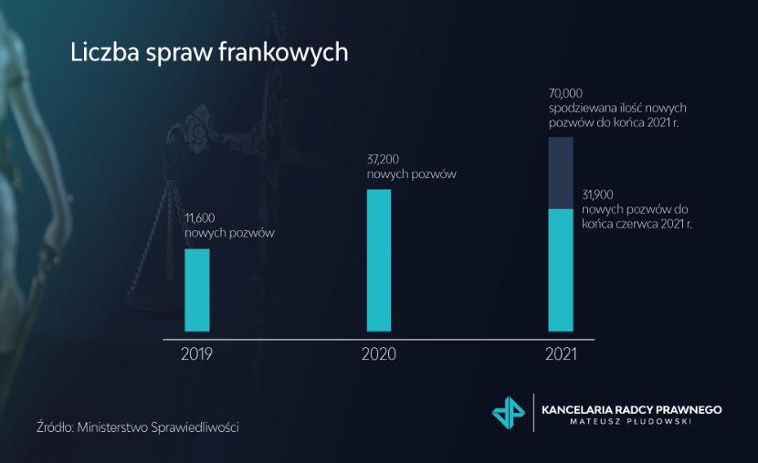 Mimo braku uchwały, proponowanych ugód i innych okoliczności liczba pozwów frankowych cały czas rośnie: 2019 r. – 11.600 nowych spraw w sądzie, 2020 r. – 37.200 nowych spraw w sądzie, 2021 r. (koniec kwietnia) – 17.000 nowych spraw w sądzie. Od kwietnia tylko do wydziału frankowego wpłynęło ponad 12.000 spraw, a przewiduje się, że do końca roku będzie ich ponad 20.000.