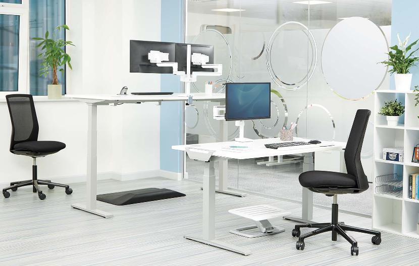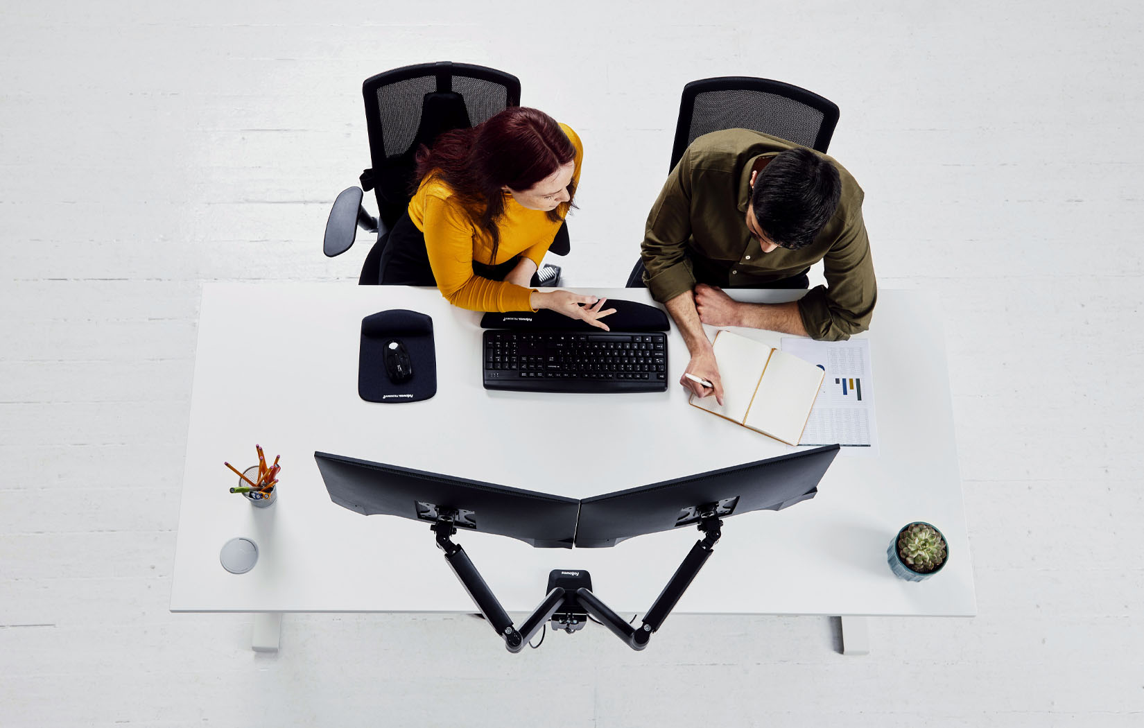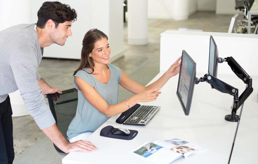 Warto pomyśleć o użyciu ramienia na monitor. Wówczas można ustawić ekran tak, aby znajdował się na pożądanej wysokości, odległości i pod właściwym kątem. To z kolei uchroni przed bólem pleców, szyi oraz zmęczeniem oczu, spowodowanym ciągłym pochylaniem się do przodu. Zarówno w przypadku osób stojących, jak i siedzących, korzystanie z ramion do monitora poprawia ergonomiczną postawę w czasie pracy, zwiększa ilość dostępnego miejsca na biurku i zapewnia większe bezpieczeństwo pracy w czasie zmiany wysokości biurka. Wybierać można spośród wolnostojących opcji montażu biurkowego albo przytwierdzić ramię monitora do blatu biurka, do jego krawędzi lub w przelotce. Montaż do blatu zapewni stabilniejsze mocowanie. Natomiast w przypadku przestrzeni roboczych bez blatu lub w miejscach o ograniczonej powierzchni biurka najlepiej wybrać ramię montowane bezpośrednio na ścianie.