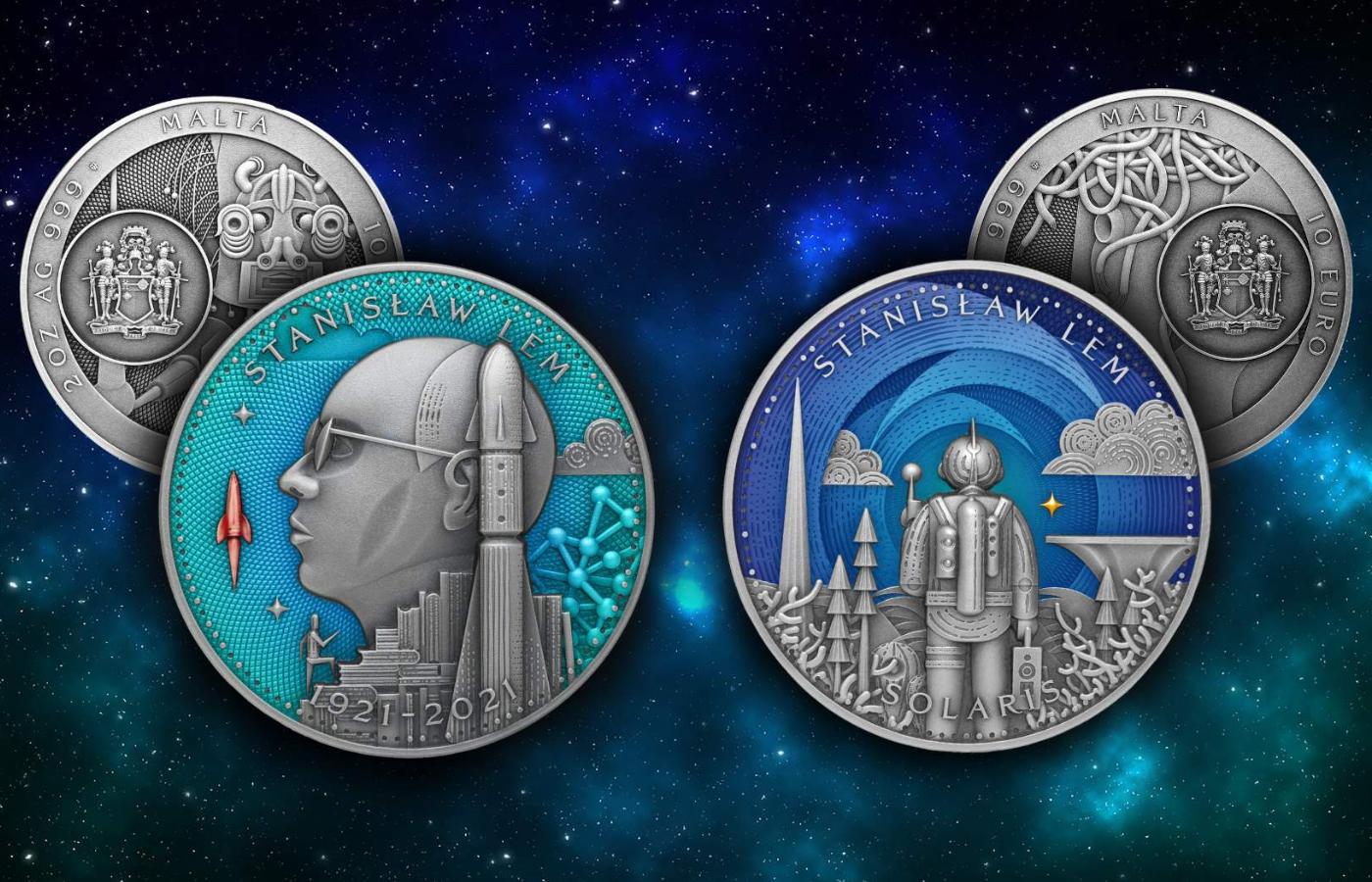 Słynnej powieści „Solaris” poświęcono już dwa filmy fabularne: radziecki z 1972 r. i hollywoodzki z 2002 r., z George’em Clooneyem w roli głównej, ale jak dotąd żadnej monety – aż do teraz. Moneta, wybita z 200 g czystego srebra (Ag 999), o średnicy 65 mm i nominale 20 euro, przedstawia na rewersie protagonistę, psychologa Krisa Kelvina, obserwującego najrozmaitsze wytwory żywego oceanu pokrywającego obcą planetę: wielopiętrowe koronkowe symetriady, asymetriady i mimoidy. Oko na wprost astronauty symbolizuje inteligentną świadomość oceanu. Moneta z 2 uncji czystego srebra, o nominale 10 euro i średnicy 45 mm, także przedstawia Kelvina wśród obcych form stworzonych przez ocean, tym razem z aparaturą badawczą w ręku, która notabene okaże się bezużyteczna. W przypadku obu monet awersem jest adaptacja grafiki Daniela Mroza.