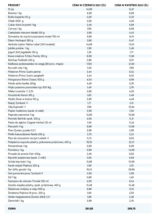 Wartość tego koszyka w sieciach dyskontów w czerwcu 2021 r. wynosiła 291,85 zł. Dokładnie te same produkty tych samych marek i producentów w kwietniu 2023, a więc w ciągu niecałych dwóch lat, wyniosła już prawie 400 zł. Za to samo płacimy prawie 109 zł więcej! Możemy się przyjrzeć, co o ile naprawdę zdrożało. Łatwiej będzie zrozumieć, dlaczego musimy kupować mniej.