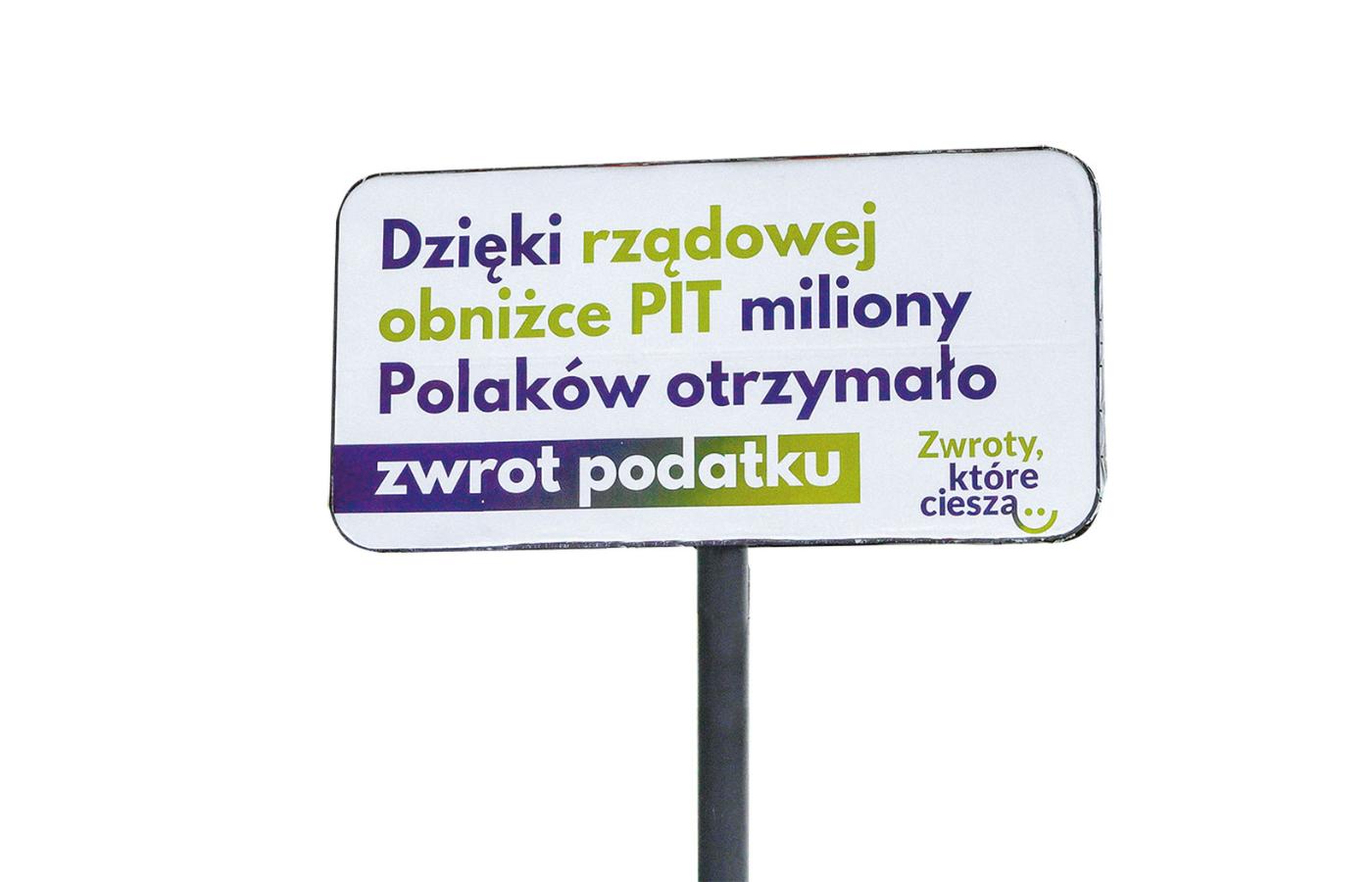 „Dzięki rządowej obniżce podatków PIT miliony Polaków otrzymało zwrot podatków” – informują billboardy w całym kraju. Kampania sugeruje, że dobry rząd (chociaż o wysokości podatków decyduje parlament) ma dla nas kolejny prezent gotówkowy. A konkretnie: 29,4 mld zł.