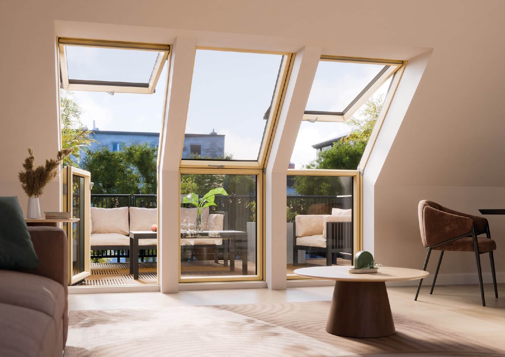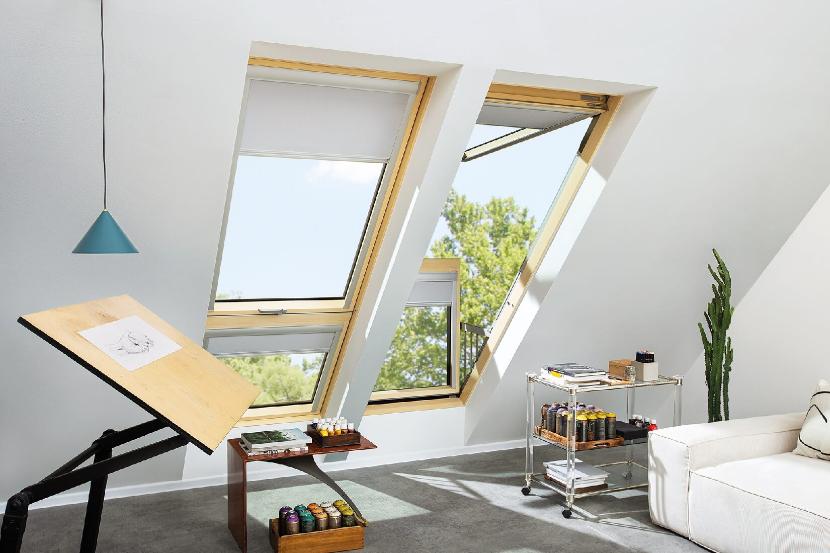 Dwuskrzydłowe okna dachowe, w których górne skrzydło otwierane jest obrotowo, a dolne jest stałe, pozwalają uzyskać efekt długiego przeszklenia sięgającego aż do podłogi, bez potrzeby zespalania okien w pionie. Delikatna wizualnie konstrukcja okna, przedzielona jedynie filigranową poprzeczką, nie zakłóca widoku na zewnątrz.