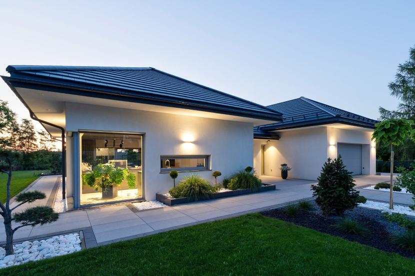 Już z daleka widać, że budynek jest mocno zakorzeniony w przestrzeni. Rozłożysta bryła, niemal przyklejona do ziemi, harmonijnie łączy horyzontalne linie elewacji z pionowym rytmem okien i wejścia. Dach wielospadowy równoważy proporcje i podkreśla osadzenie domu w krajobrazie. Kompozycja jest powściągliwa, ale nie pozbawiona ekspresji – jej siłą są detale: szkło, linia, rytm.