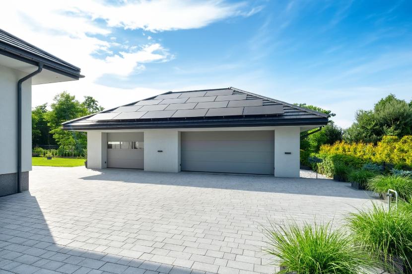 Na posesji znajdują się także dwa garaże – każdy z nich stanowi część tej samej spójnej opowieści. W garażu wolnostojącym wykorzystano bramy segmentowe UniPro. Pierwsza to brama jednostanowiskowa z przeszkleniem, druga to klasyczna brama dwustanowiskowa. Garaż w bryle domu zamyka brama UniTherm. Wszystkie trzy bramy pozostają w spójnej kolorystyce HI Comfort Grey. Szarość ponownie działa jak rama dla światła i przestrzeni, a nie jako akcent dominujący.