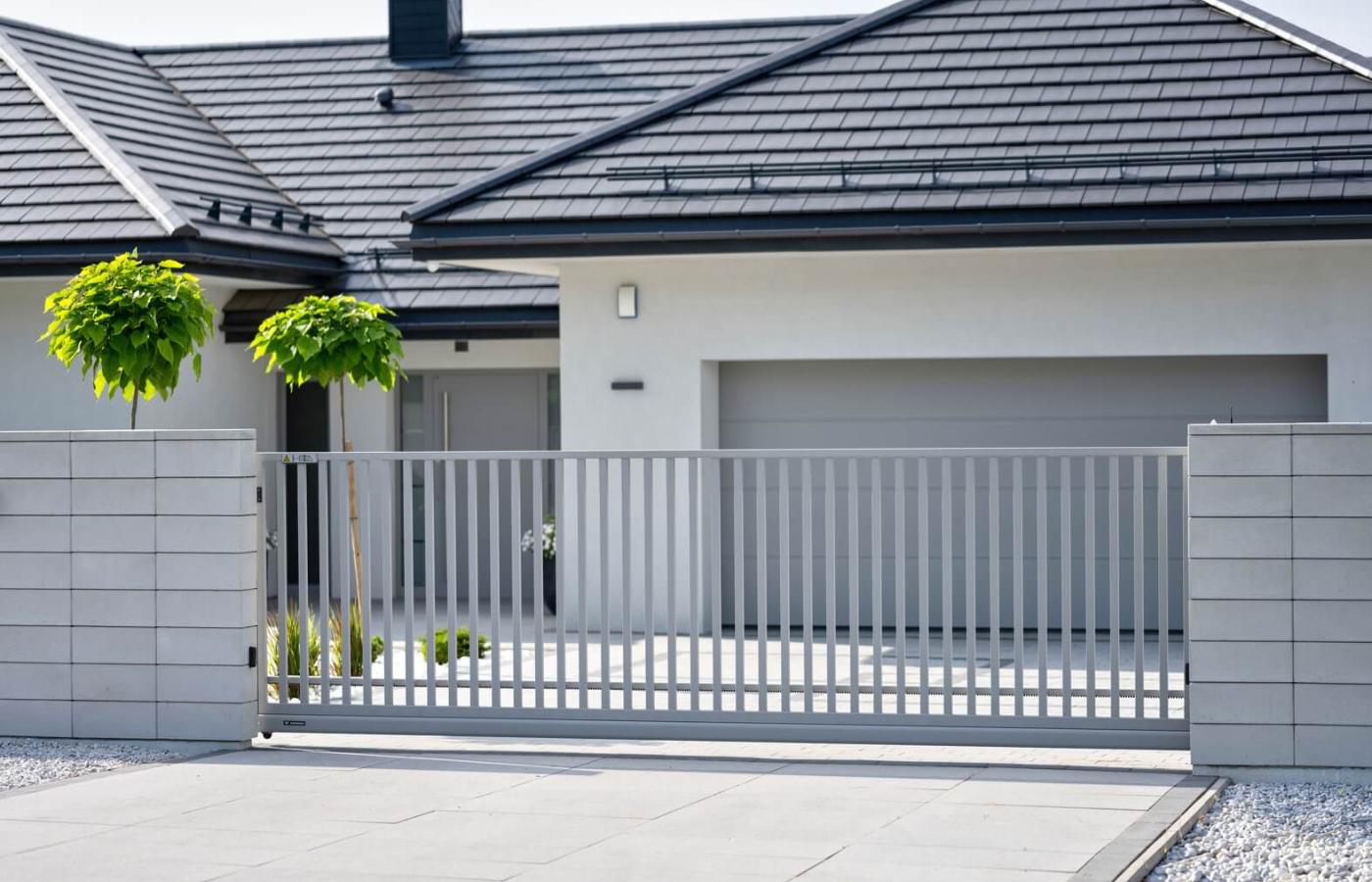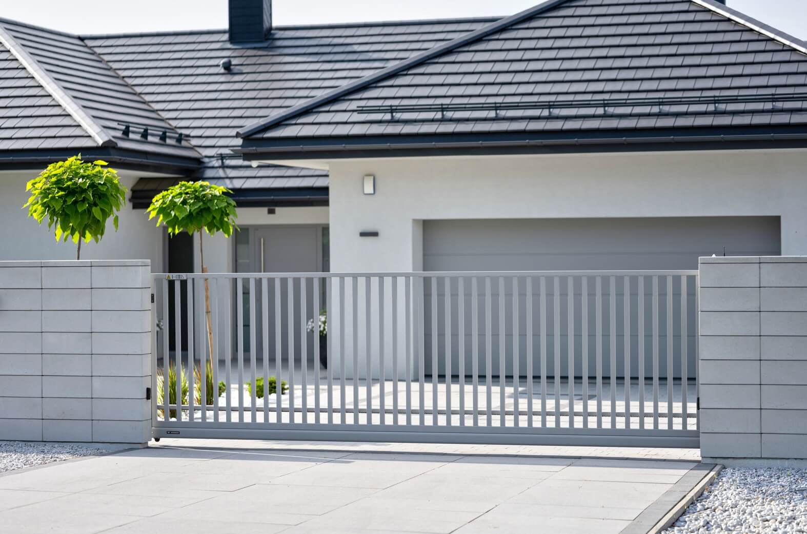 Granica posesji ma tu charakter subtelny – nie oddziela, lecz domyka przestrzeń. System CLASSIC AW.10.70 obejmuje bramę przesuwną, furtkę i przęsła, wszystkie utrzymane w tonacji HI Comfort Grey. Rytmiczny układ pionowych profili współgra z geometrią fasady, tworząc wizualny porządek i ciągłość. Brama przesuwna z napędem ukrytym w szafie pozwala zachować czystą linię ogrodzenia – funkcja nie przysłania formy. Furtka i przęsła powtarzają ten sam rytm, dzięki temu ogrodzenie nie stanowi bariery, ale spójną, powściągliwą i elegancką ramę. System ten, wykonany w technologii DUPLEX, łączy cynkowanie ogniowe i malowanie proszkowe, co gwarantuje wieloletnią odporność na korozję.