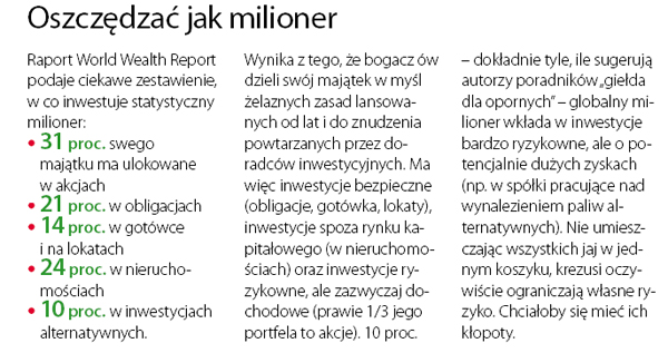 Dane dotyczące polskich milionerów są na tym tle skąpe. W aktualnym klimacie społecznym i politycznym już samo publiczne przyznanie się, że bez problemów starcza nam do pierwszego, jest ryzykowne. Oczywiście i u nas osób majętnych przybywa wraz z szybkim rozwojem gospodarki. Nie ma tygodnia bez debiutu co najmniej jednej spółki na warszawskiej giełdzie. A każdy debiut, jak obliczono, to co najmniej trzech nowych milionerów. Według szacunków Instytutu Badań nad Gospodarką Rynkową w Polsce co roku przybywa 600 osób dysponujących co najmniej milionem dolarów. A ta kwota na świecie stanowi przepustkę do bankowości prywatnej.