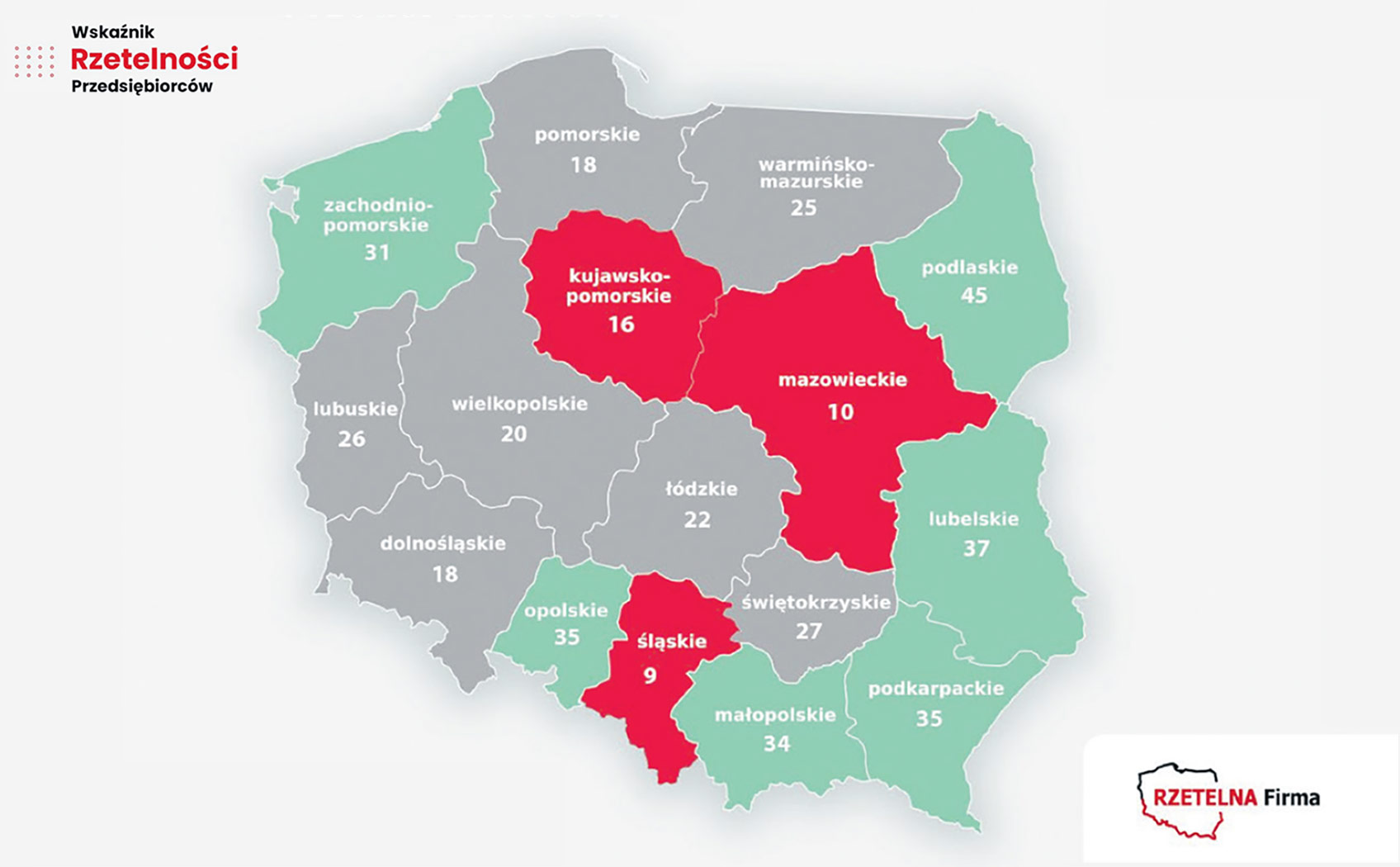 Przez lata firmy oceniały kontrahentów głównie przez pryzmat branży, wielkości biznesu czy dotychczasowej współpracy. Jednak przy podejmowaniu decyzji handlowych warto brać pod uwagę jeszcze jedną kwestię: miejsce pro-wadzenia działalności. Z najnowszego Wskaźnika Rzetelności Przedsiębiorców, opracowanego przez Rzetelną Firmę i KRD, wynika, że na Śląsku nieuregulowane zobowiązania ma 10,7 proc. firm, podczas gdy w Podkarpackiem 6,5 proc. Do województw z najniższym odsetkiem firm z zaległościami należą również: Małopolska – 6,7 proc., Podlasie – 7 proc. i Święto-krzyskie – 7,1 proc. W Mazowieckiem średnia kwota zaległości przypadająca na jednego dłużnika wynosi ok. 50 tys. zł i jest najwyższa w kraju.