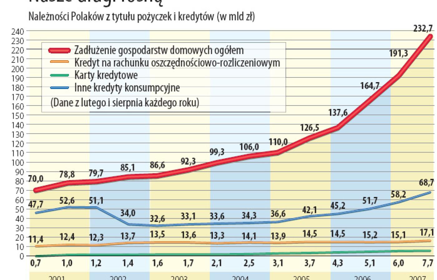 Według Narodowego Banku Polskiego zadłużenie gospodarstw domowych przekroczyło w sierpniu br. 232 mld zł i rośnie. W ciągu ostatniego półrocza nasz dług powiększył się o ponad 40 mld zł (z tego o 2 mld na kontach i rachunkach kart kredytowych oraz aż o 10 mld, jeśli idzie o kredyty gotówkowe, samochodowe i ratalne). Takiego skoku nie notowano dotychczas w historii polskiej gospodarki. Nawet w złotej końcówce lat 90., kiedy Polaków po raz pierwszy ogarnęło szaleństwo kredytobrania.