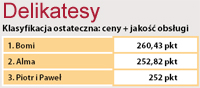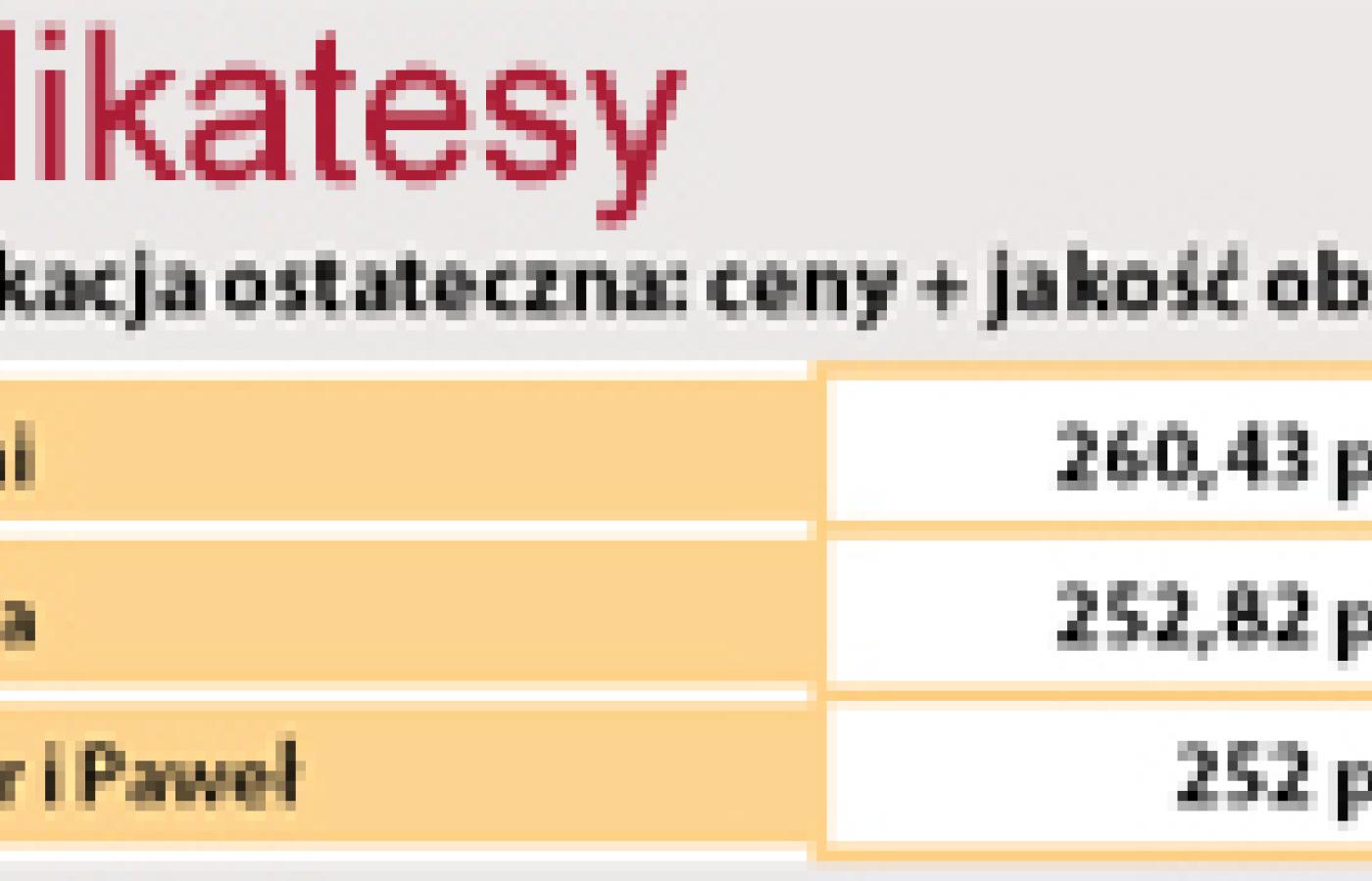 Porównanie cen pomiędzy trzema sieciami delikatesów nie wskazuje, niestety, wyraźnego lidera w kategorii najtańszy. Jak widać w tabeli, Alma, Bomi oraz Piotr i Paweł cenowo idą łeb w łeb, różnica między nimi wynosi ok. 1 zł. Piotr Woś, jeden z założycieli sieci Piotr i Paweł, zapewnia, że ta zbieżność jest przypadkowa: - Delikatesów jest tak mało, że nie konkurujemy ze sobą bezpośrednio. Swoich cen wzajemnie nie monitorujemy, bo naszym punktem odniesienia są ceny w pobliskich super- i hipermarketach. Skoro wszyscy stosujemy identyczną strategię, może stąd biorą się te podobieństwa? Inne wytłumaczenie jest takie, że delikatesy nie konkurują ze sobą, bo na razie nie muszą. Poza tym ich klient na niskich cenach się nie skupia.