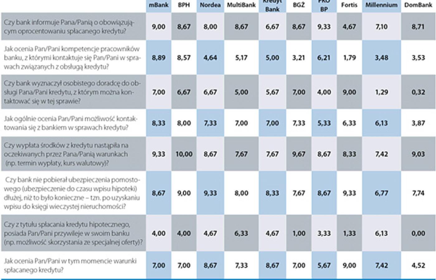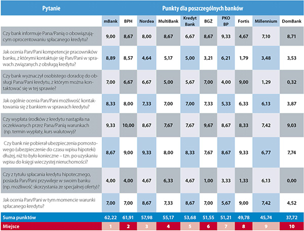Punkty za każde z ośmiu pytań sumują się do ostatecznej klasyfikacji. Łącznie najwyższą ocenę wśród swych klientów otrzymał internetowy mBank (62,22 pkt na 100 możliwych do zdobycia). Uzyskał najwyższe noty, jeśli chodzi o informowanie swych klientów i kompetencje pracowników. Jest też w czołówce, jeśli chodzi o terminowość wypłaty pieniędzy. Po wpisie do hipoteki bank szybko przestaje pobierać dodatkowe opłaty. Co ciekawe – bardzo wysoko oceniono możliwość kontaktowania się z bankiem w sprawach związanych z kredytem. A przecież mBank to instytucja działająca niemal wyłącznie w Internecie, własnych placówek (tzw. mKiosków) ma zaledwie po kilka w każdym województwie. W tym banku jednak, jeśli jesteśmy wiernie spłacającym raty klientem, rzadko możemy liczyć na dodatkowe specjalne oferty.